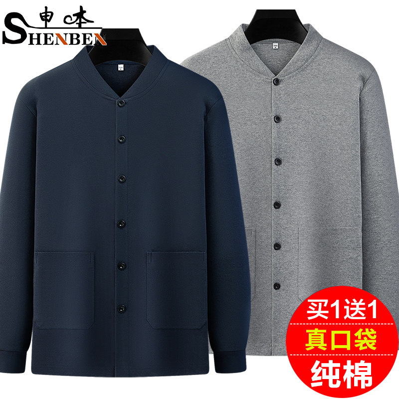 申本新款中老年纯棉开衫长袖t恤男士全棉打底衫爷爷上衣对襟大码