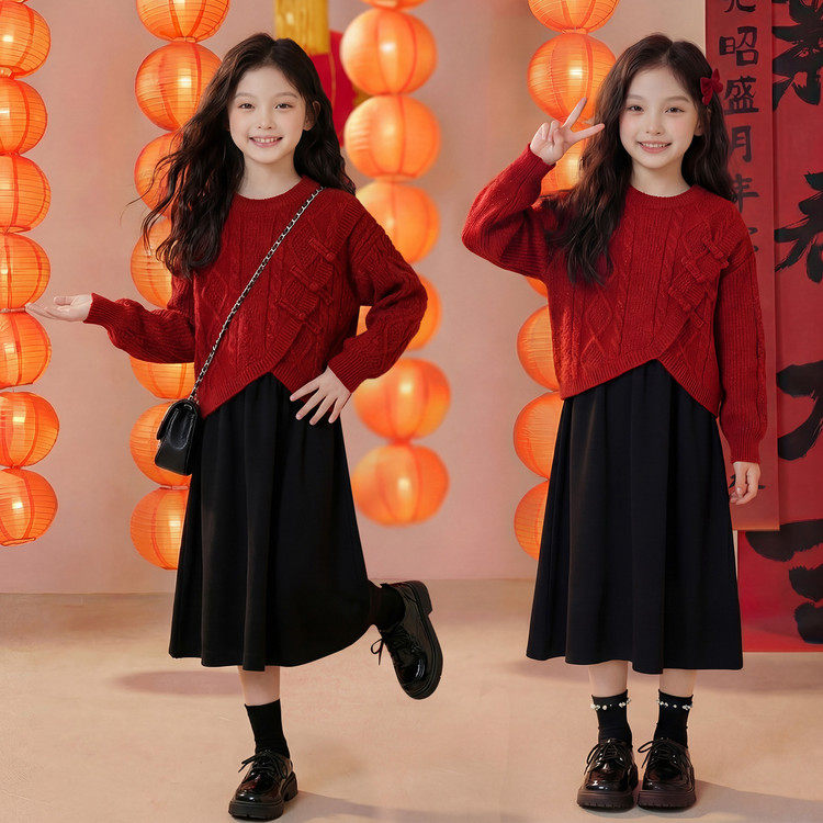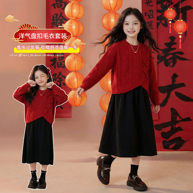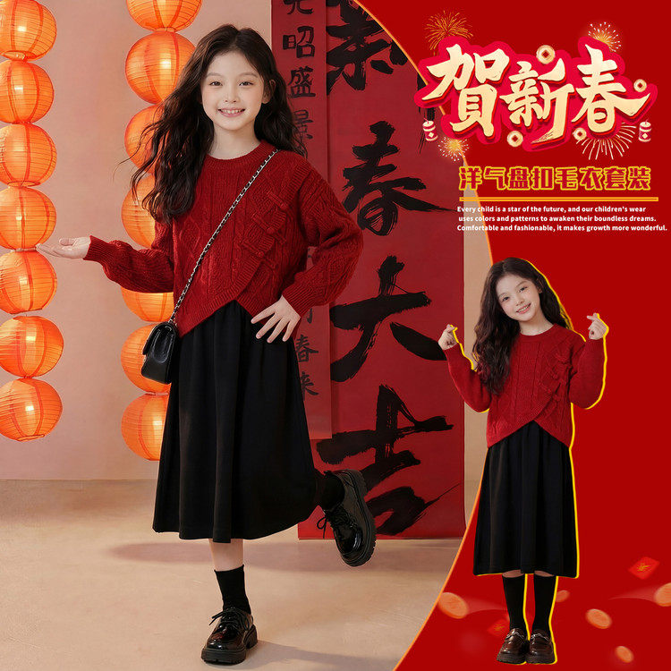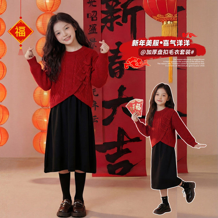 女童拜年服秋冬款2025新款中国红毛衣背心裙女宝宝两件套裙子套装