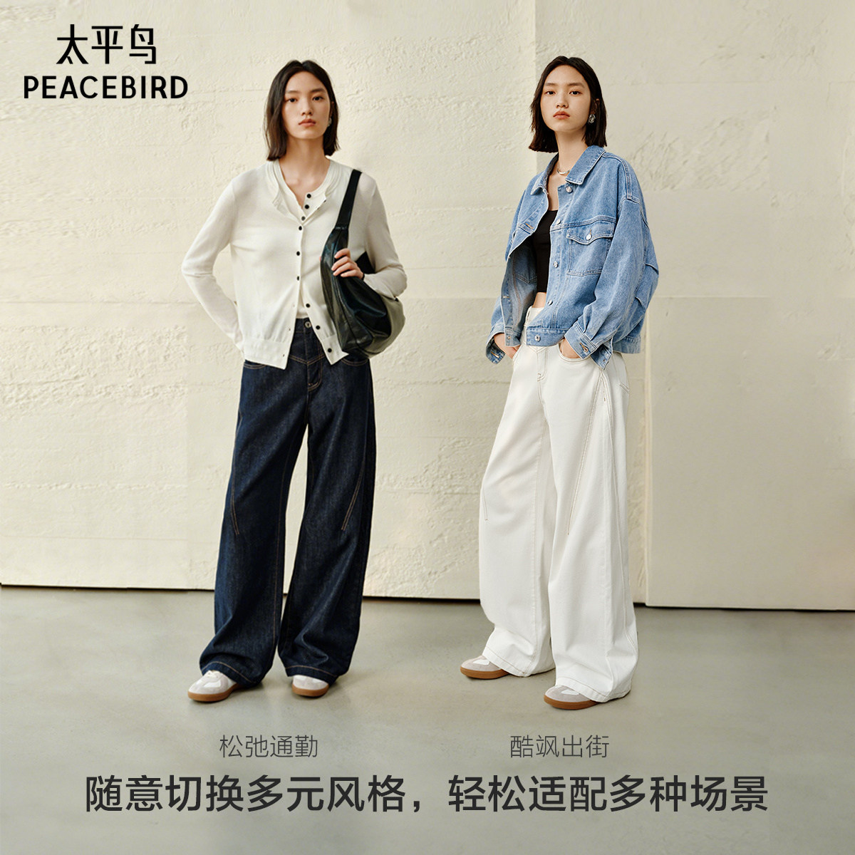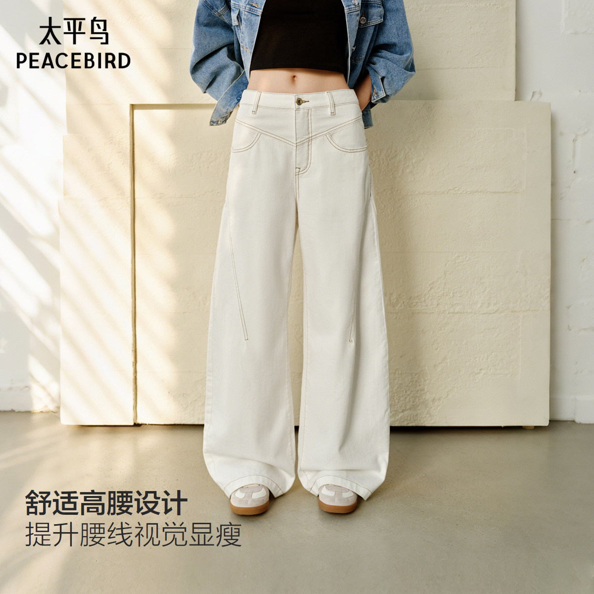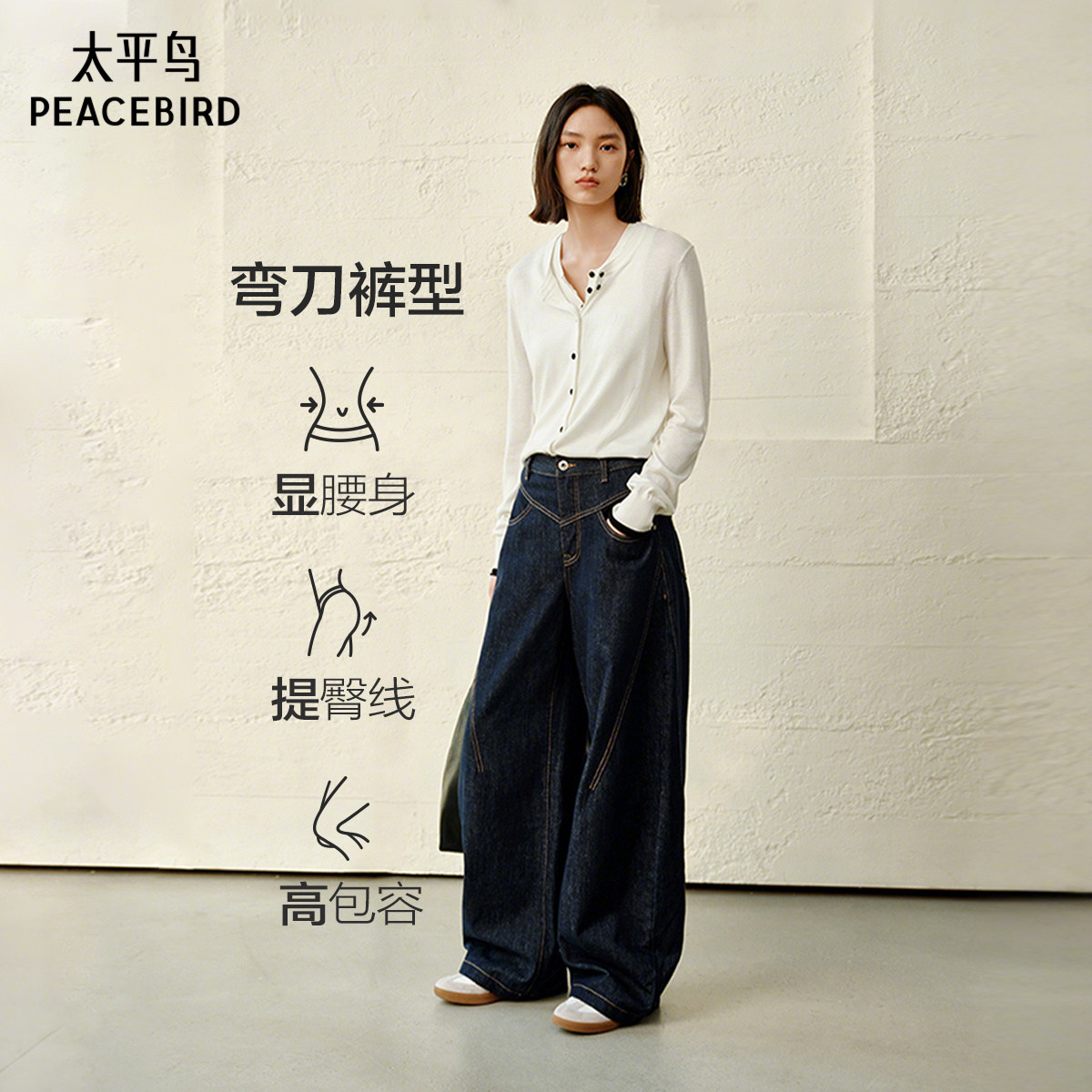太平鸟高腰弯刀牛仔裤秋季宽松显瘦茧型香蕉阔腿牛仔裤