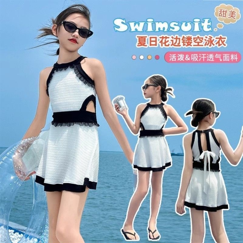 女生泳衣女大童初中生带胸垫儿童连体款女童白色游泳衣裙子少女孩