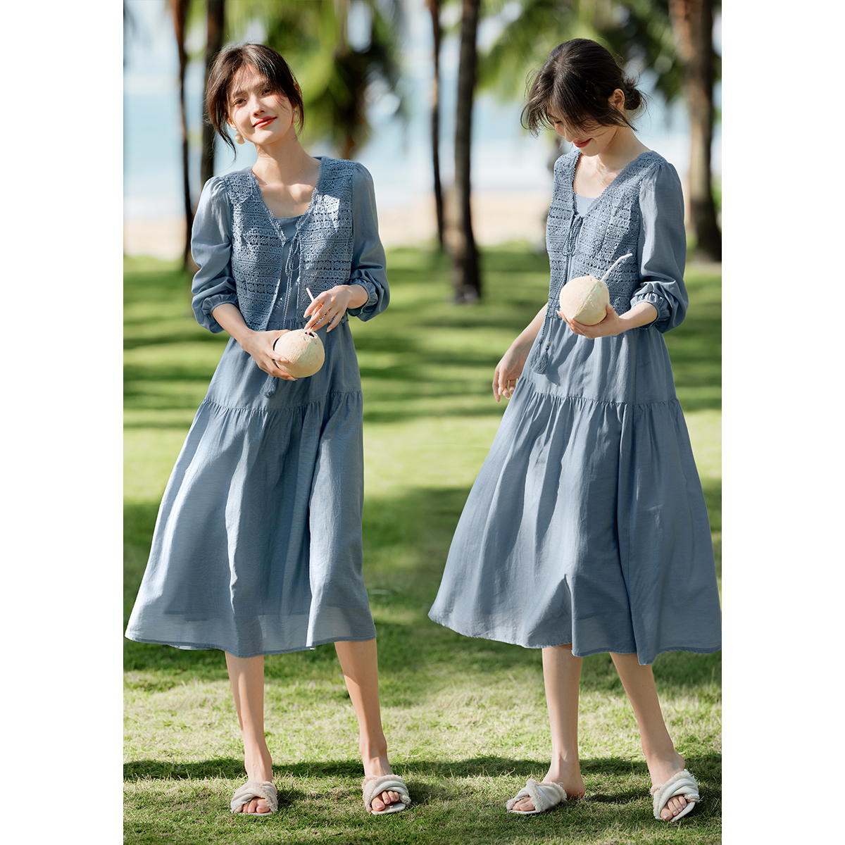 XWI欣未莱赛尔镂空肌理感假两件连衣裙女秋季海边度假风显瘦裙