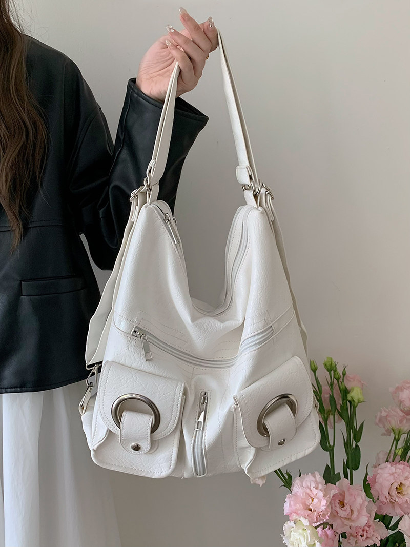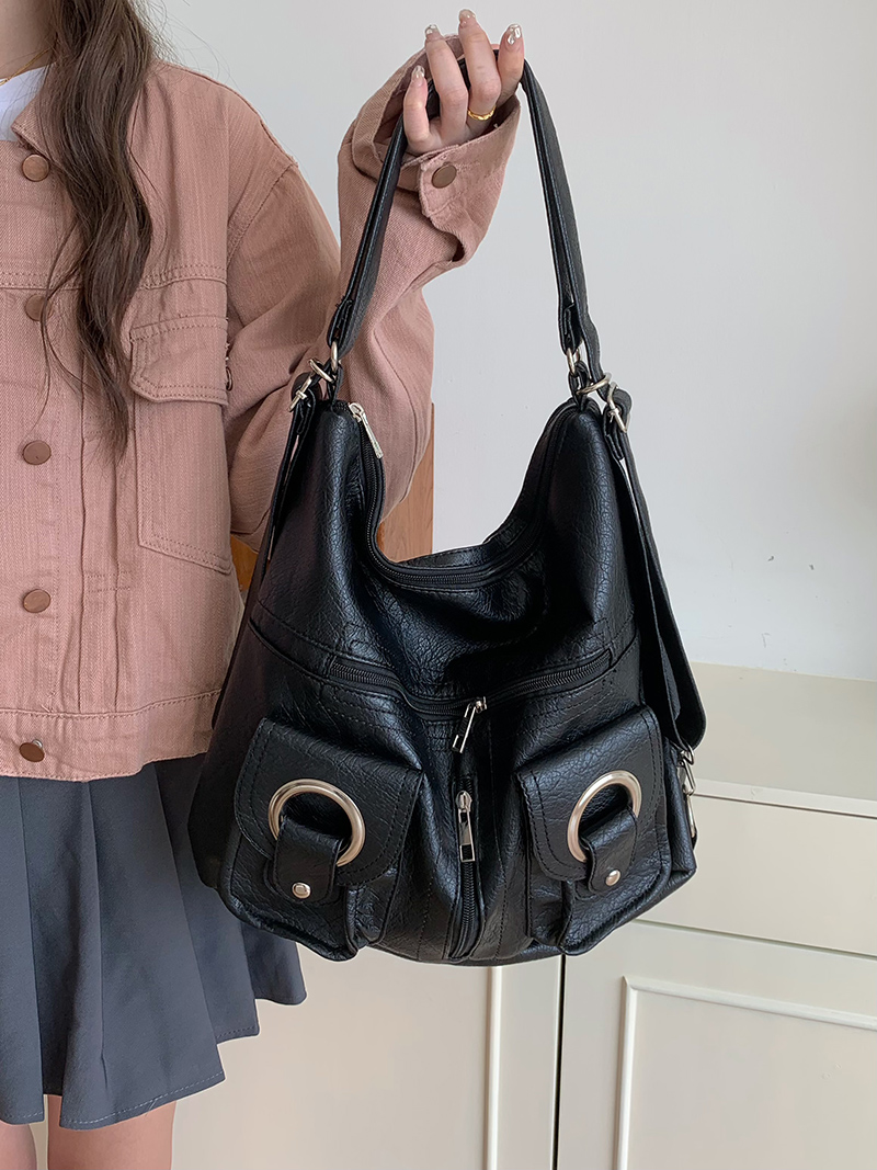 韩版简约个性百搭时髦拉链口袋PU皮托特包单肩包通勤大容量双肩包