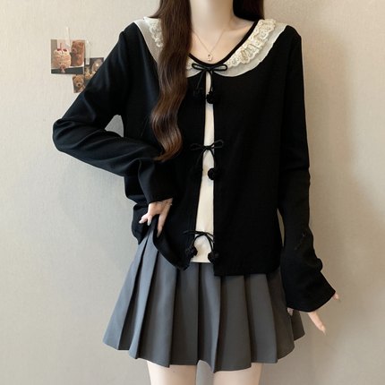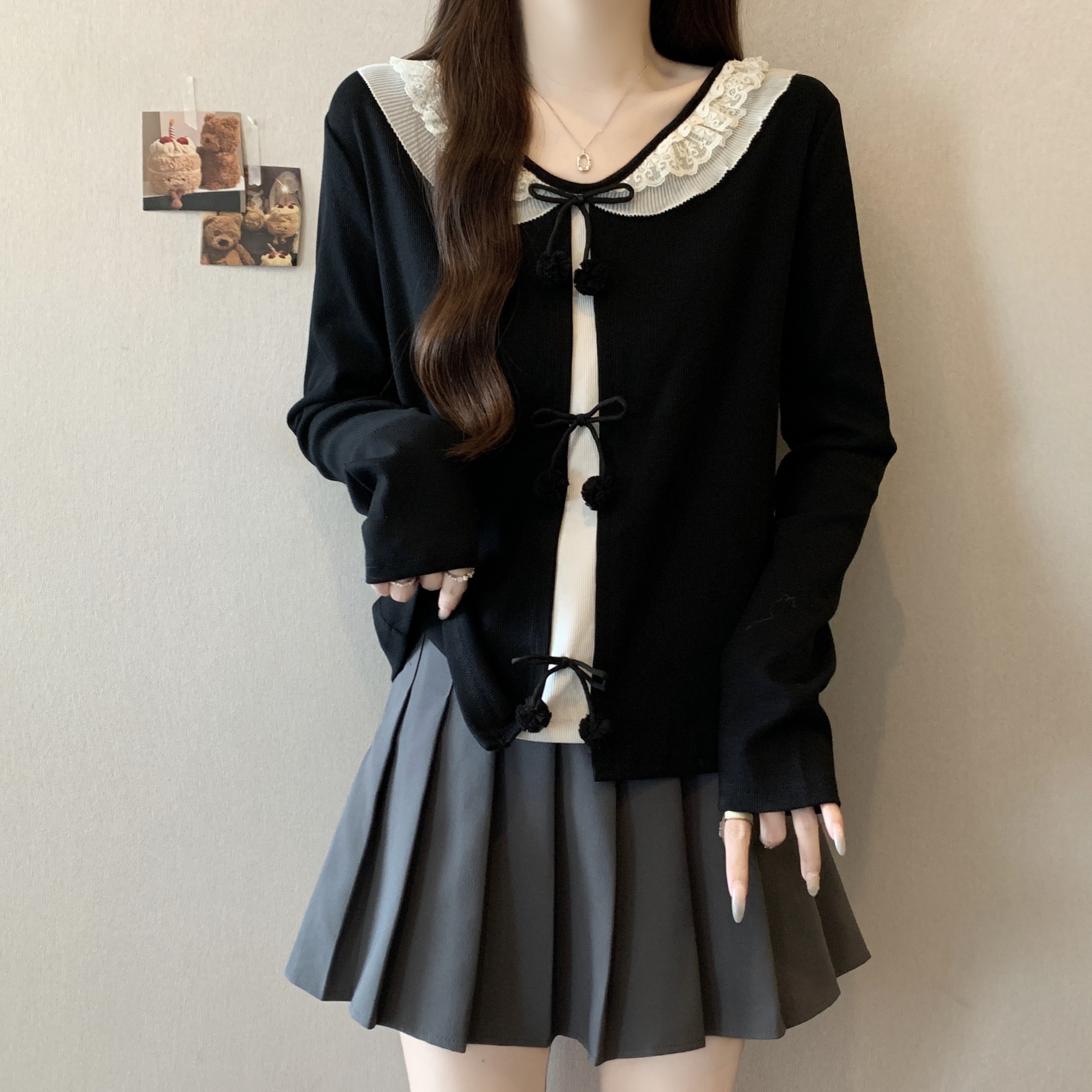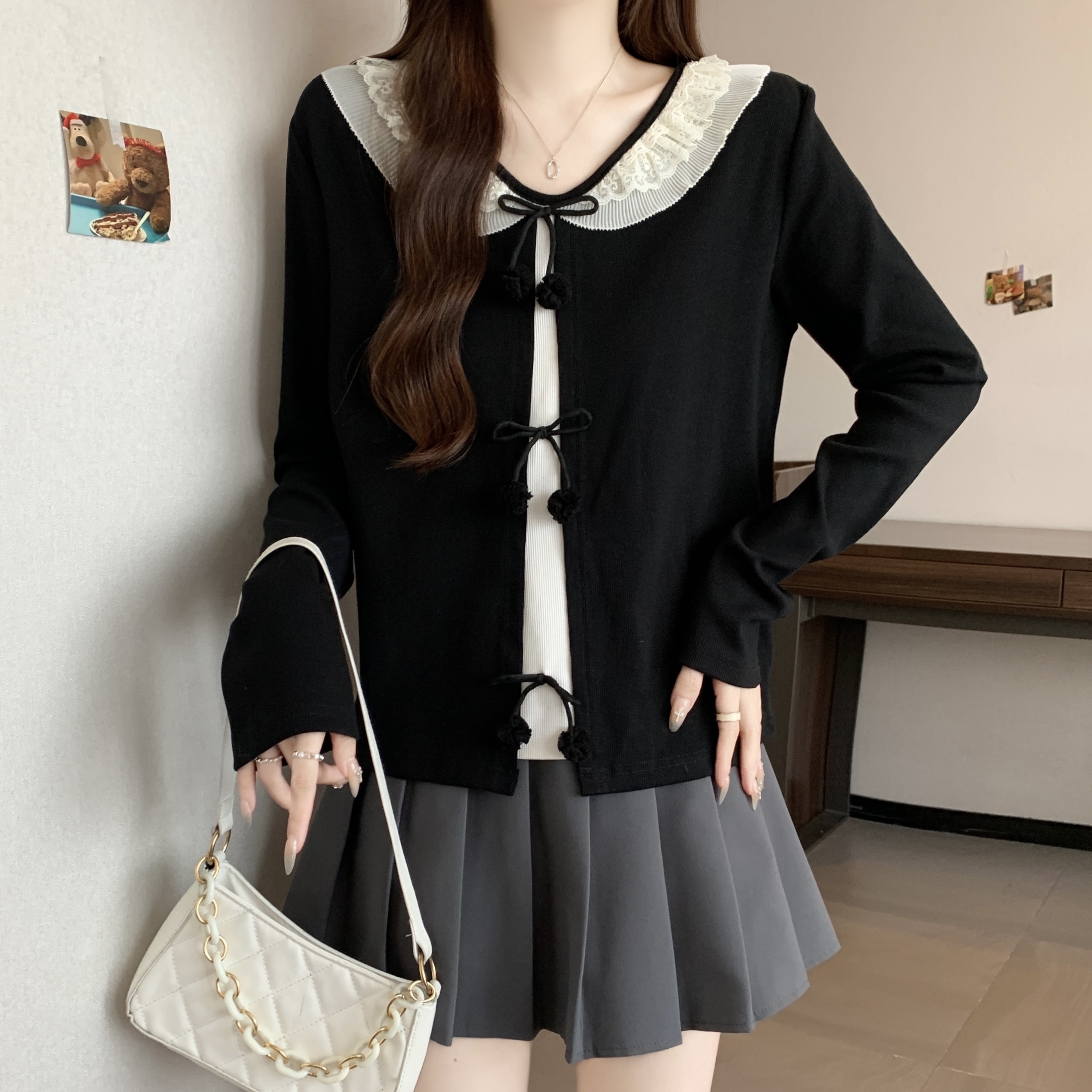 实拍~大码秋新款女蝴蝶结长袖针织衫胖mm显瘦打底内搭假两件上衣