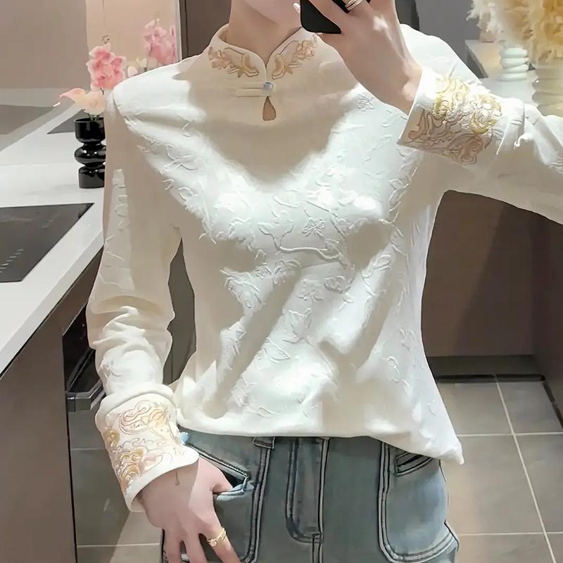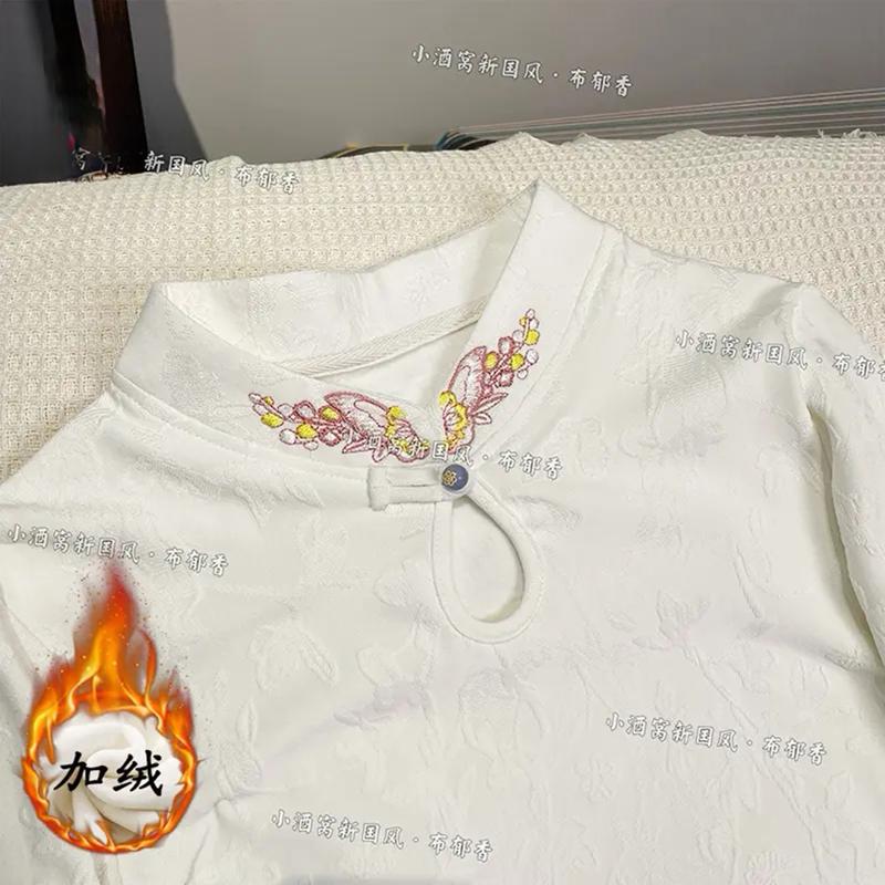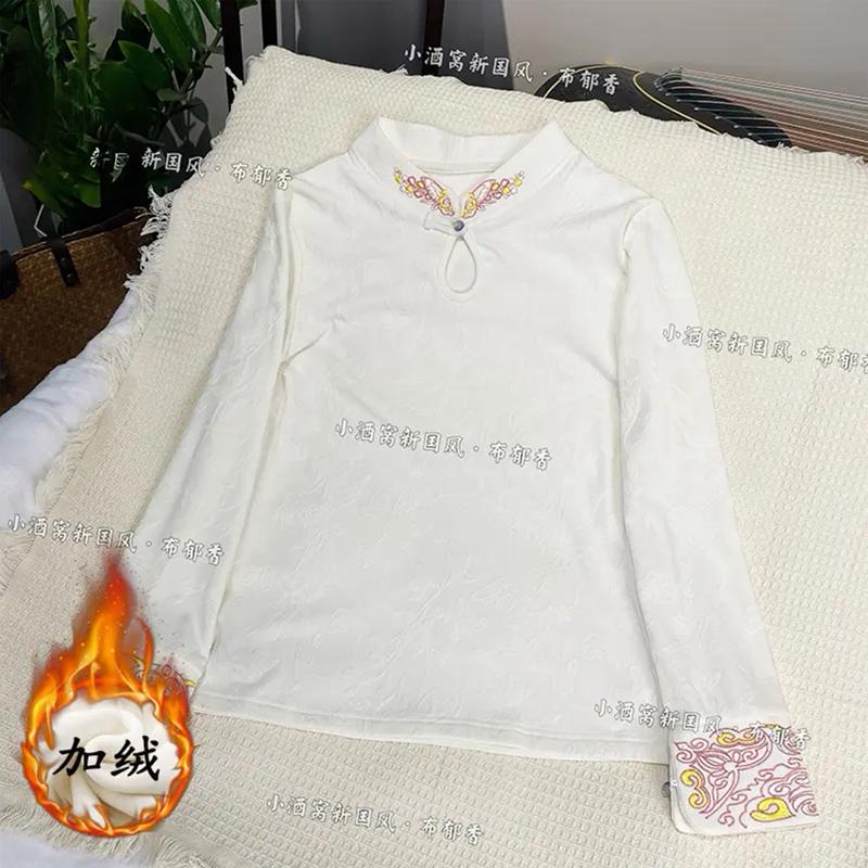 秋冬季薄绒加厚保暖打底衫上衣女新中式国风刺绣立领长袖T恤小衫