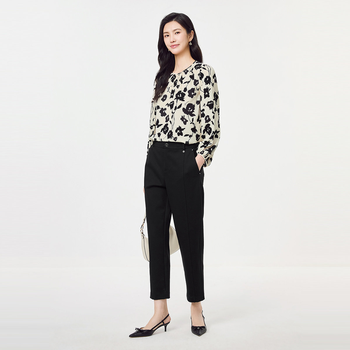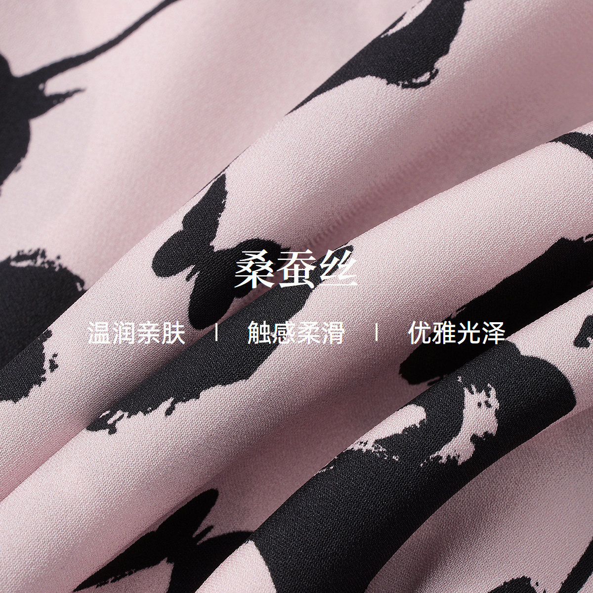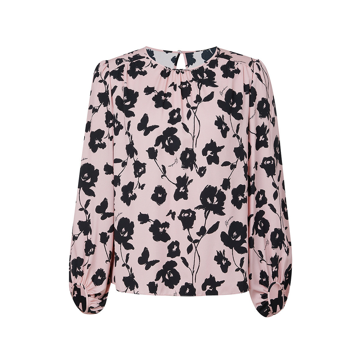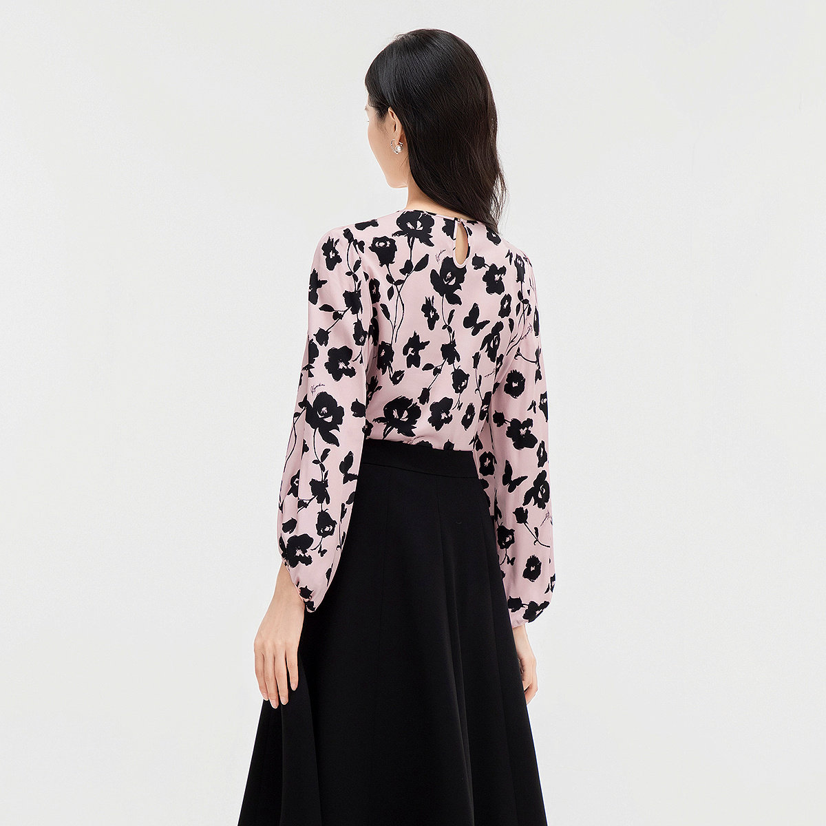 珂莱蒂尔弹力桑蚕丝复古宫廷玫瑰印花珠钻圆领甜美风灯笼袖衬衫春