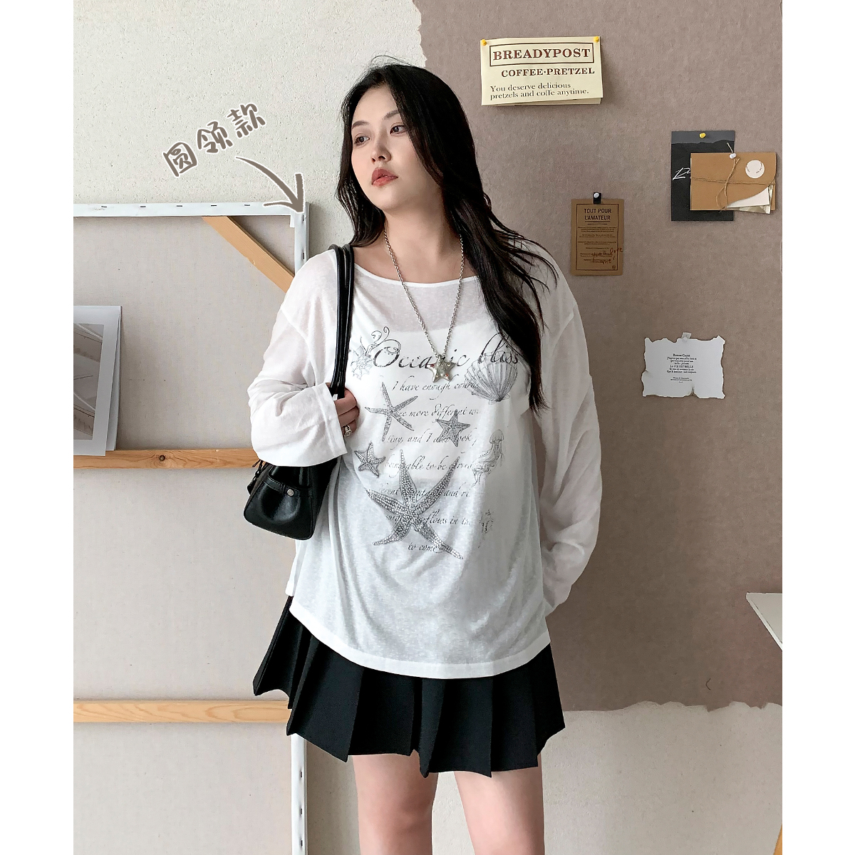 CV大码女装秋季新款莱赛尔圆领V领原创海星印花烫钻长袖T恤女胖mm