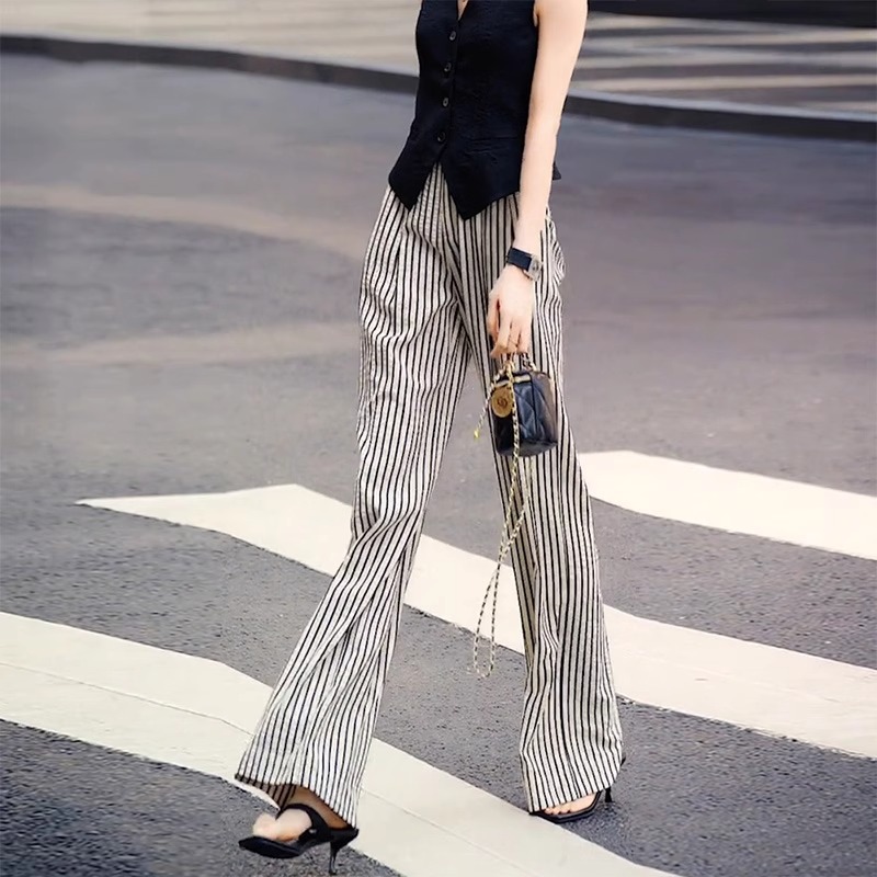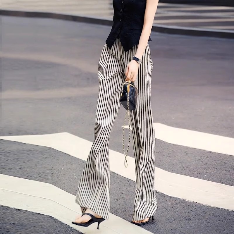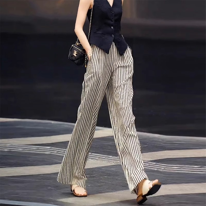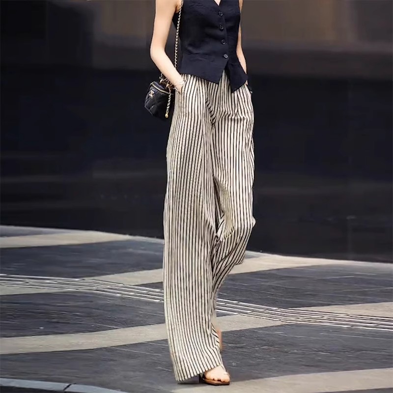 竖条纹高腰阔腿裤女夏薄款2025新款宽松遮肉百搭时髦感休闲拖地裤