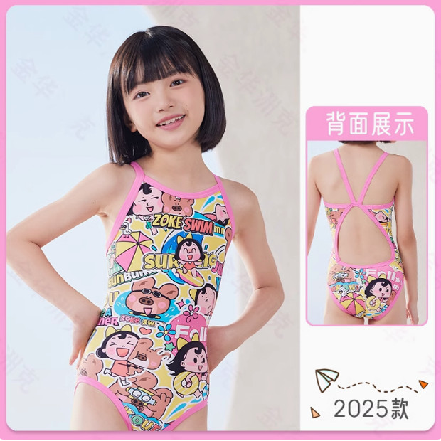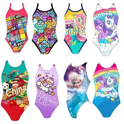 zoke青少年儿童泳衣卡通紫色小马莉女童女孩专业训练连体三角泳衣