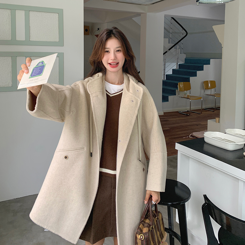燕麦色连帽双面羊绒大衣女2025冬季新款奶fufu宽松小个子毛呢外套