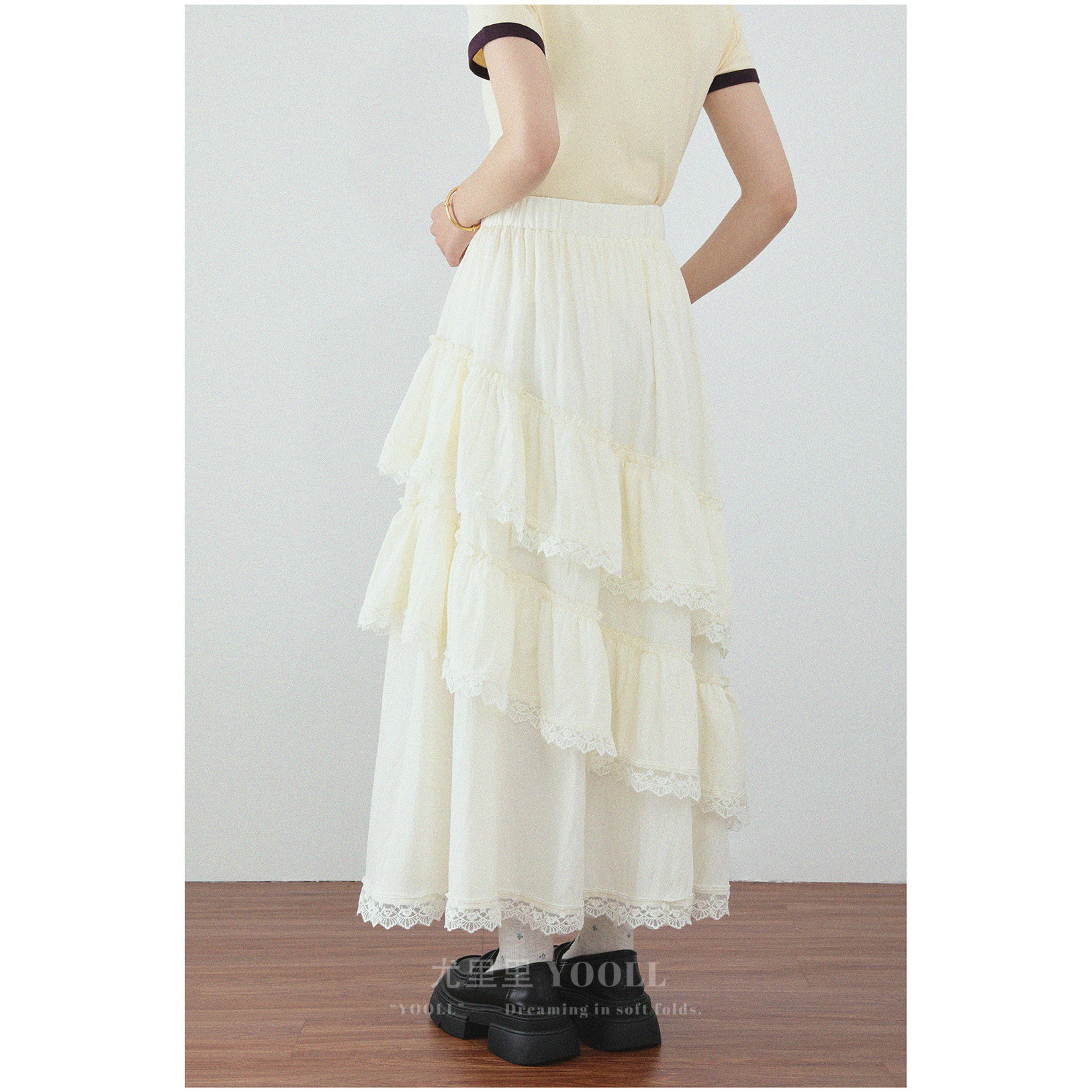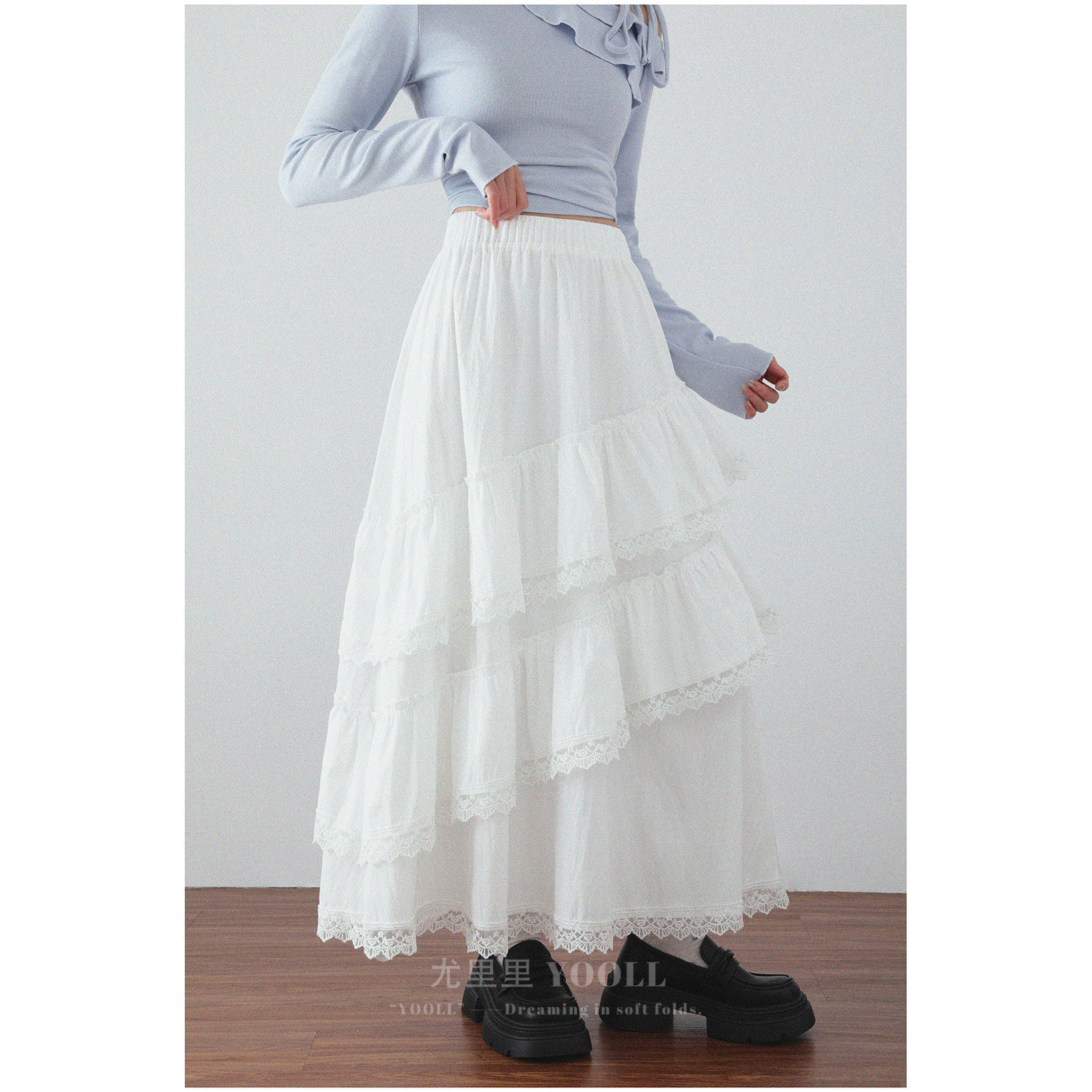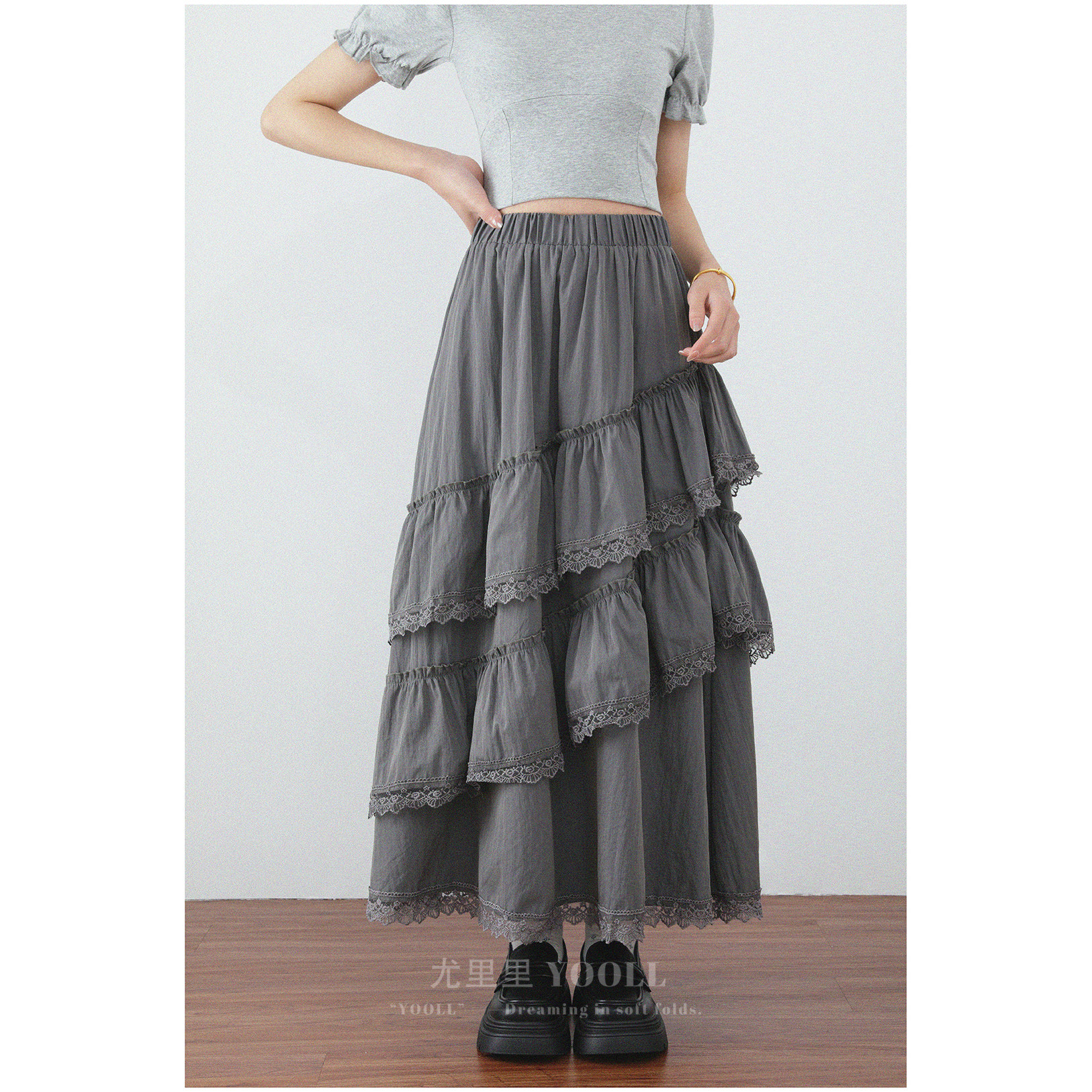 甜美荷叶边蕾丝拼接半身裙春夏新款层层叠蓬蓬蛋糕裙高腰A字长裙