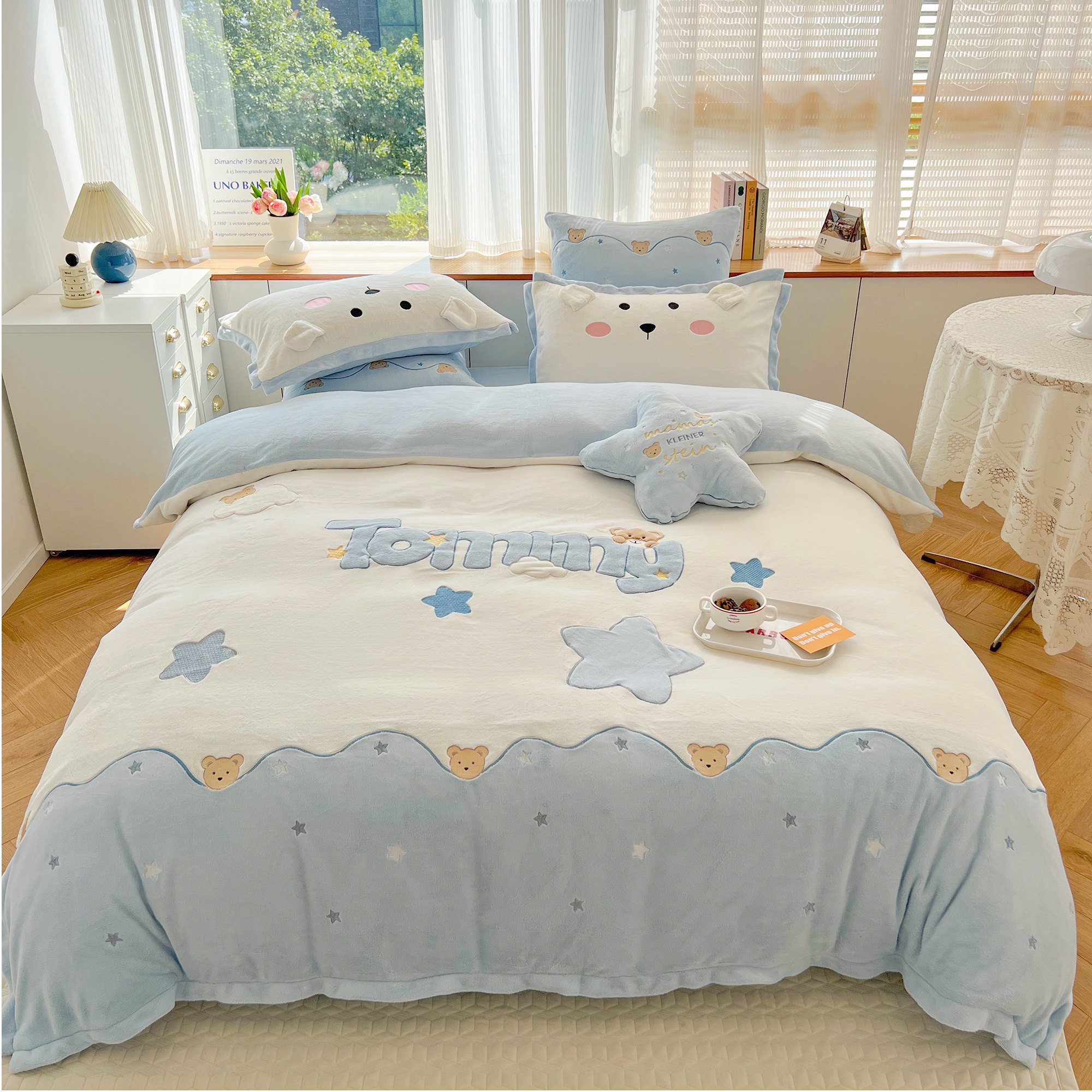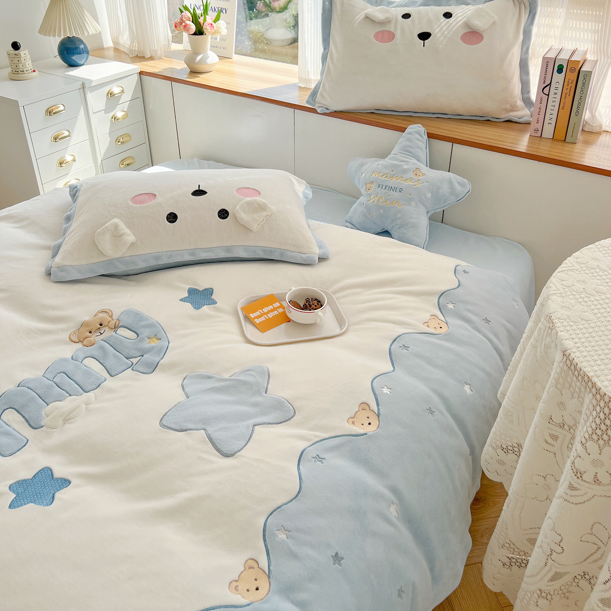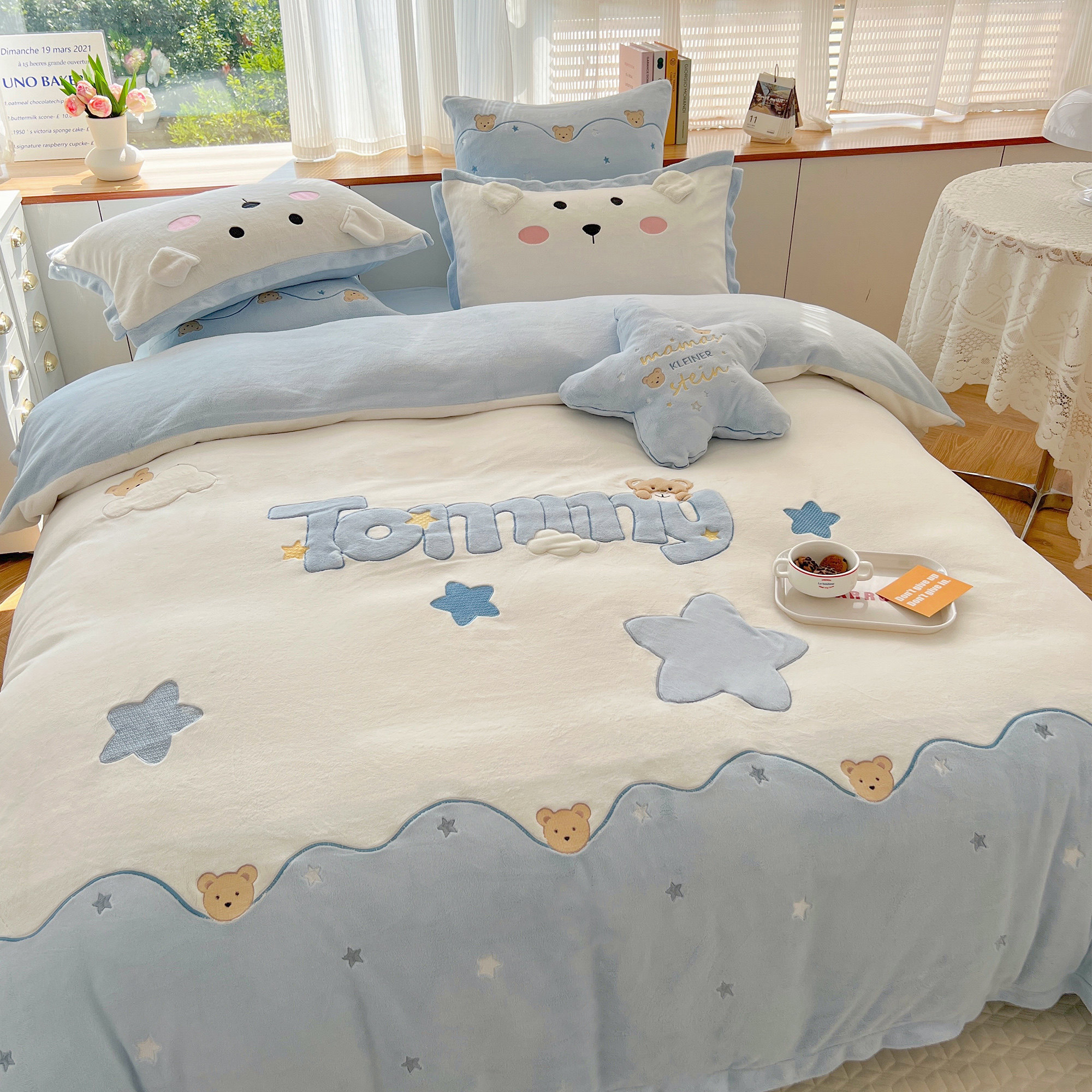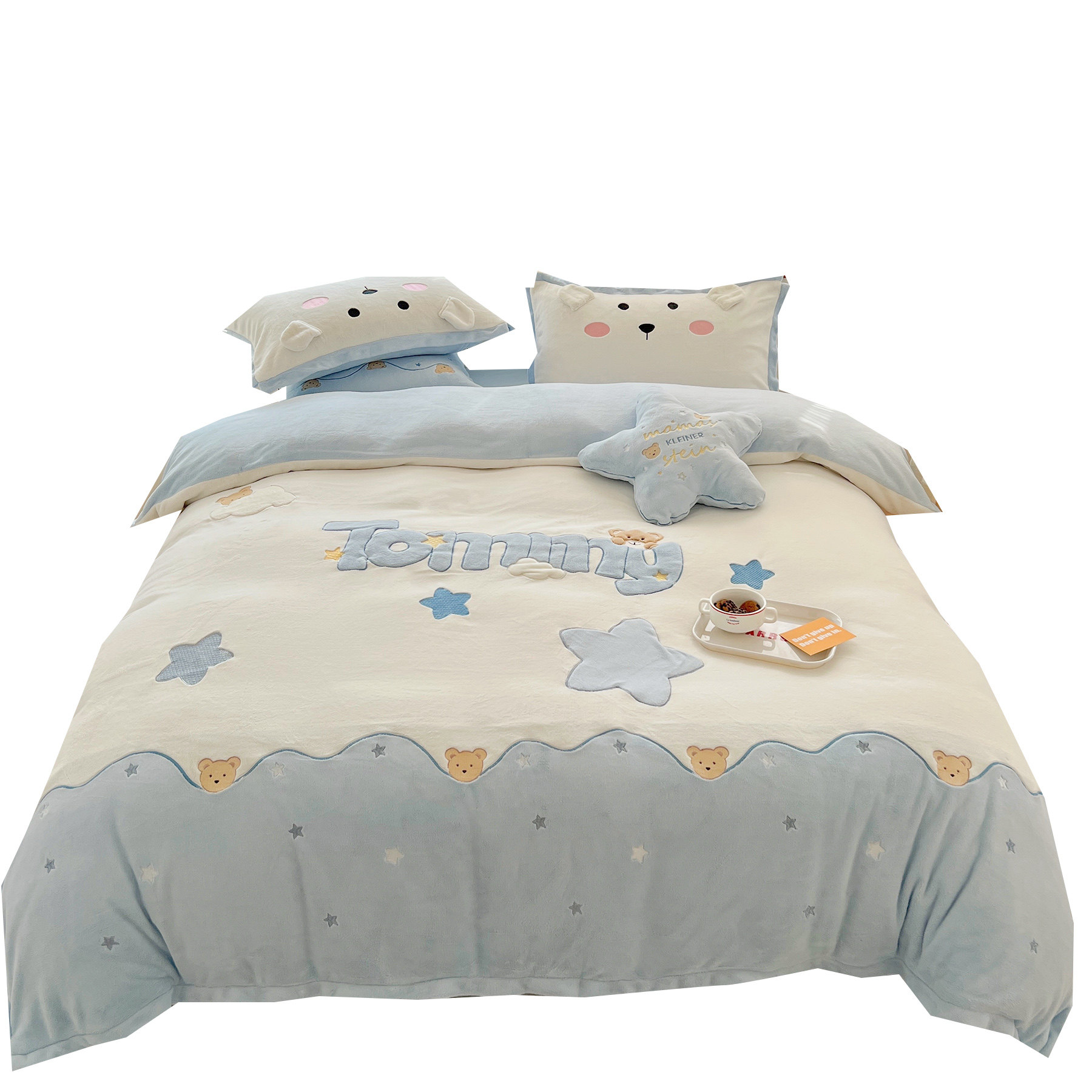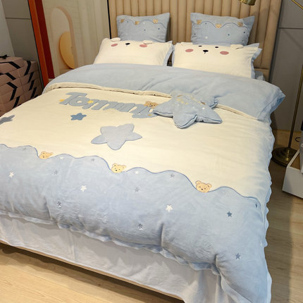 蓝色小清新可爱小熊牛奶绒四件套暖冬加厚珊瑚绒双面绒冬季法兰绒