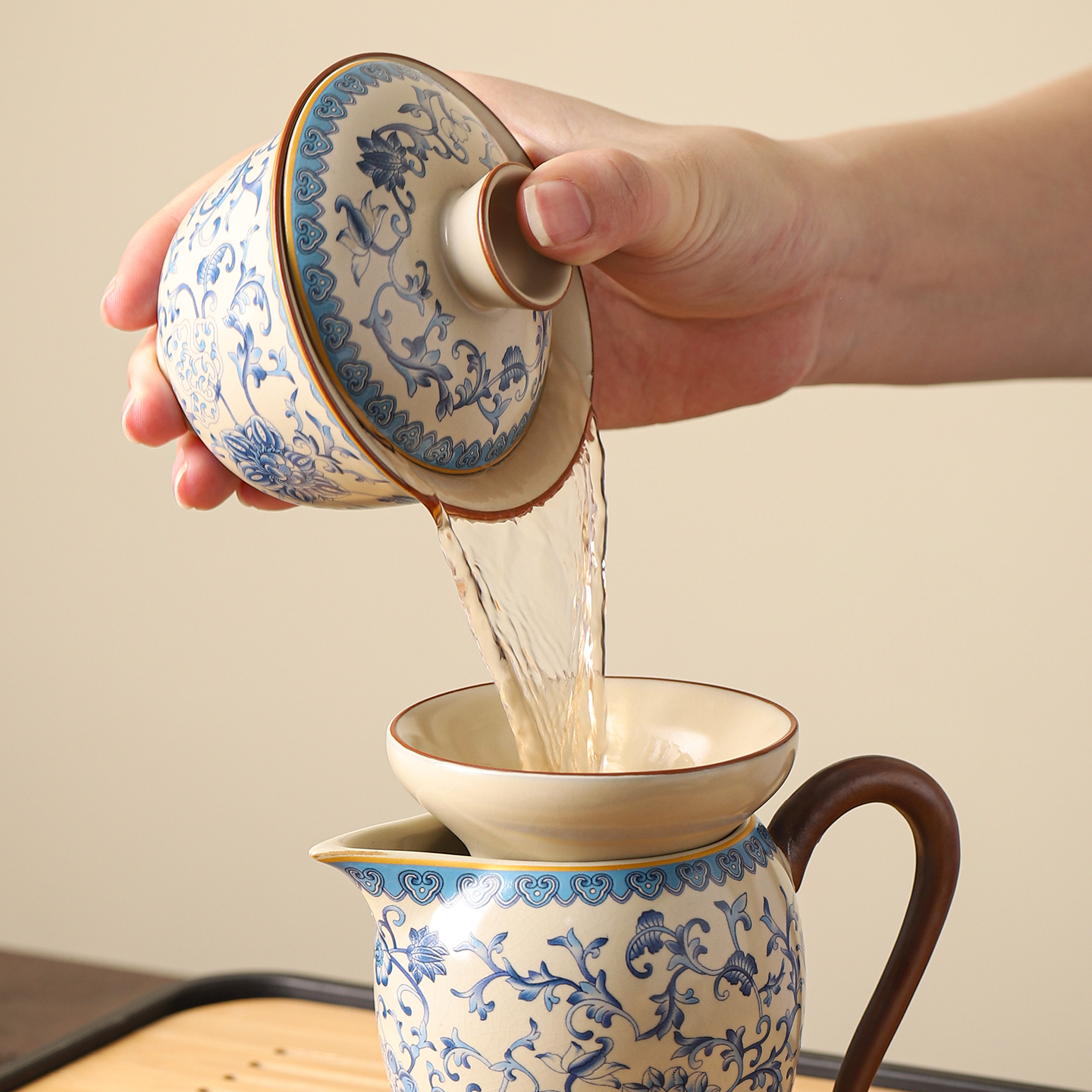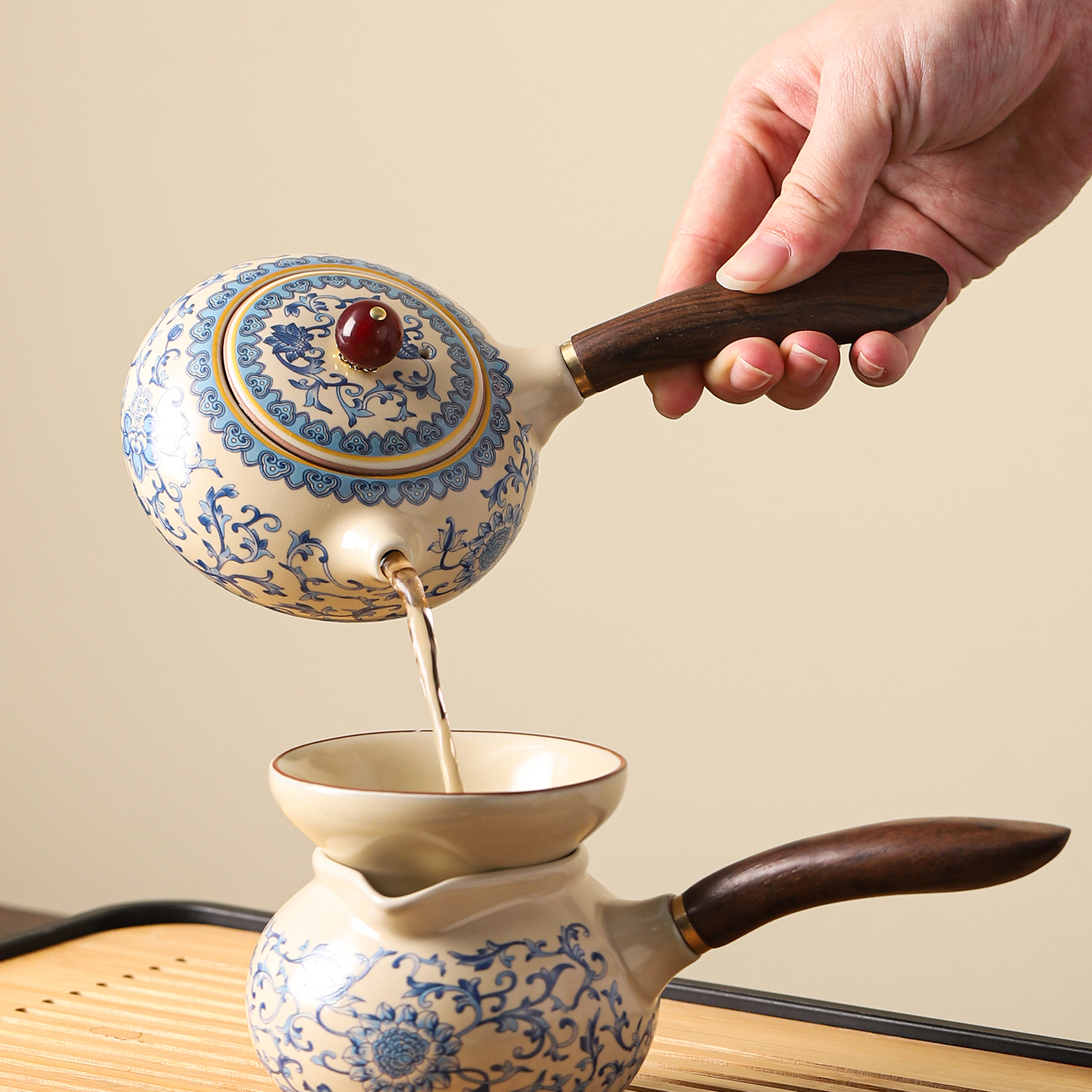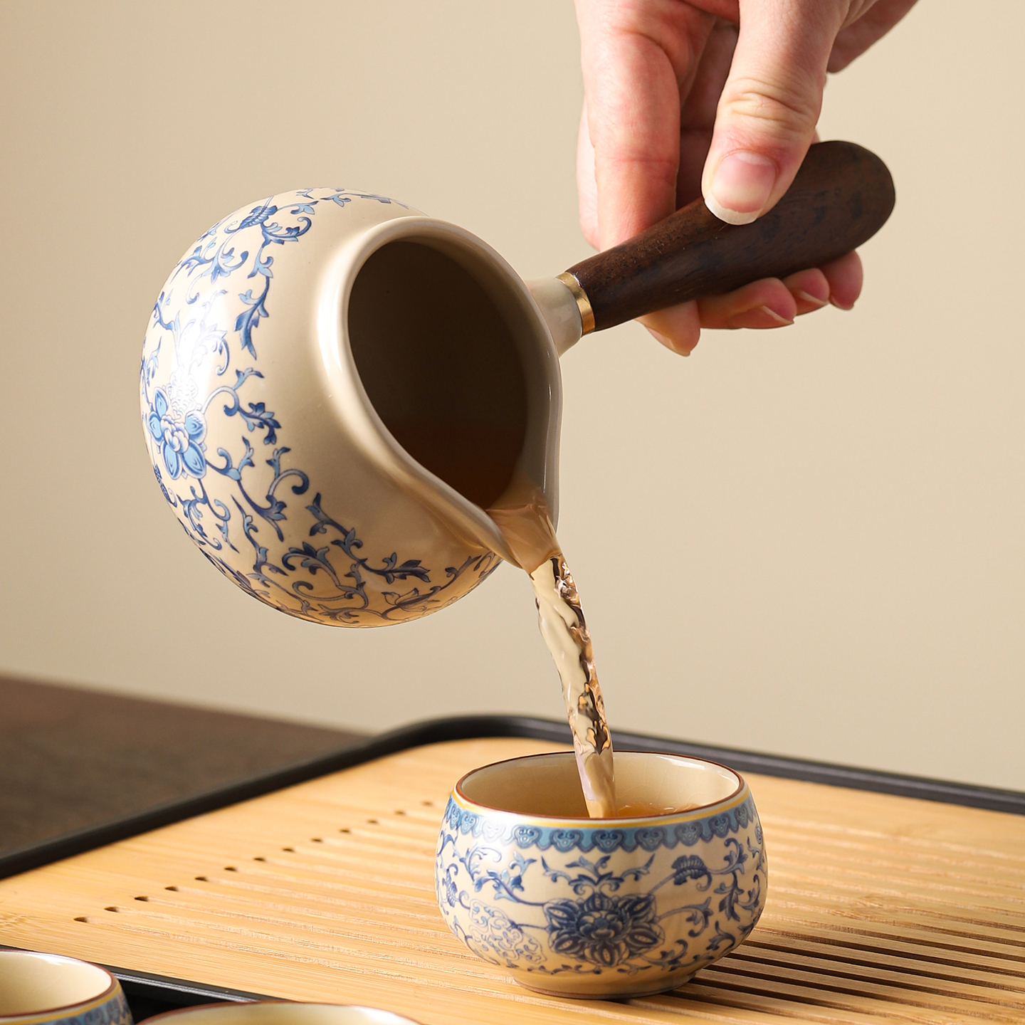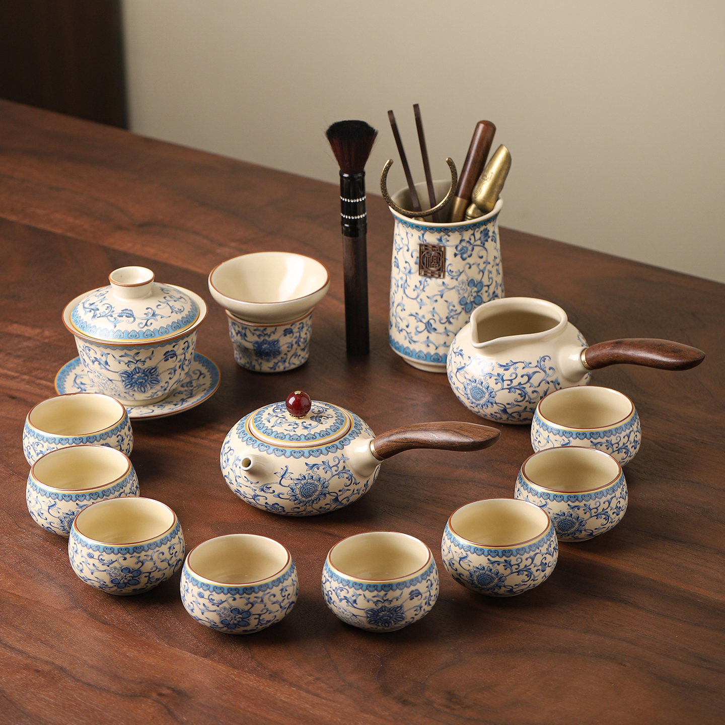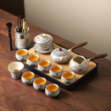 汝窑青花功夫茶具套装家用陶瓷侧把壶茶杯整套高档办公会客泡茶器