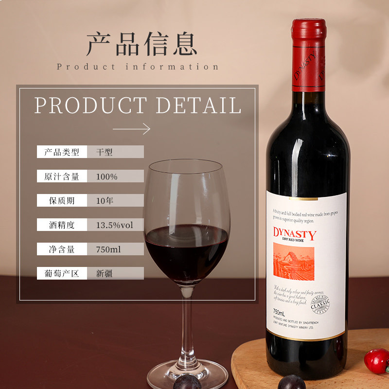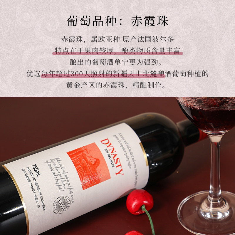 Dynasty王朝经典干红葡萄酒750mL瓶装新疆天山北麓赤霞珠官方正品
