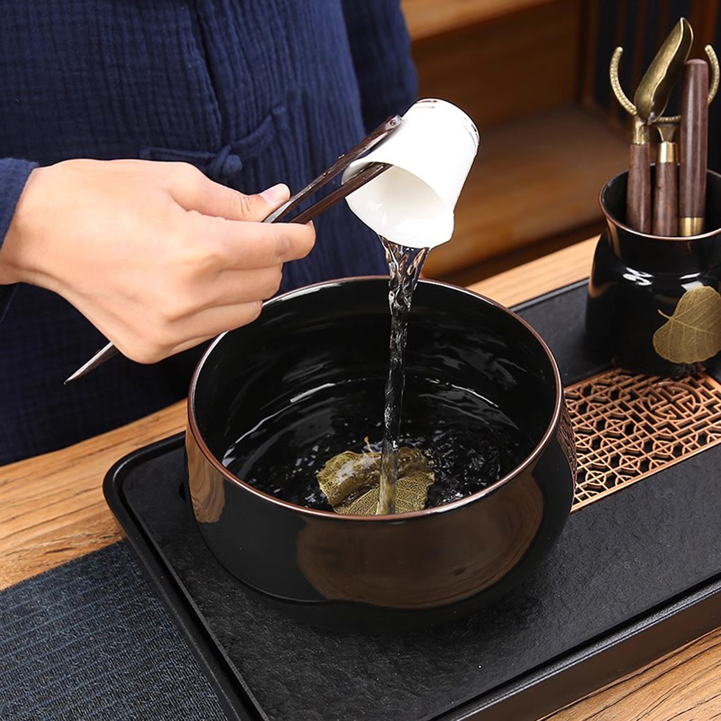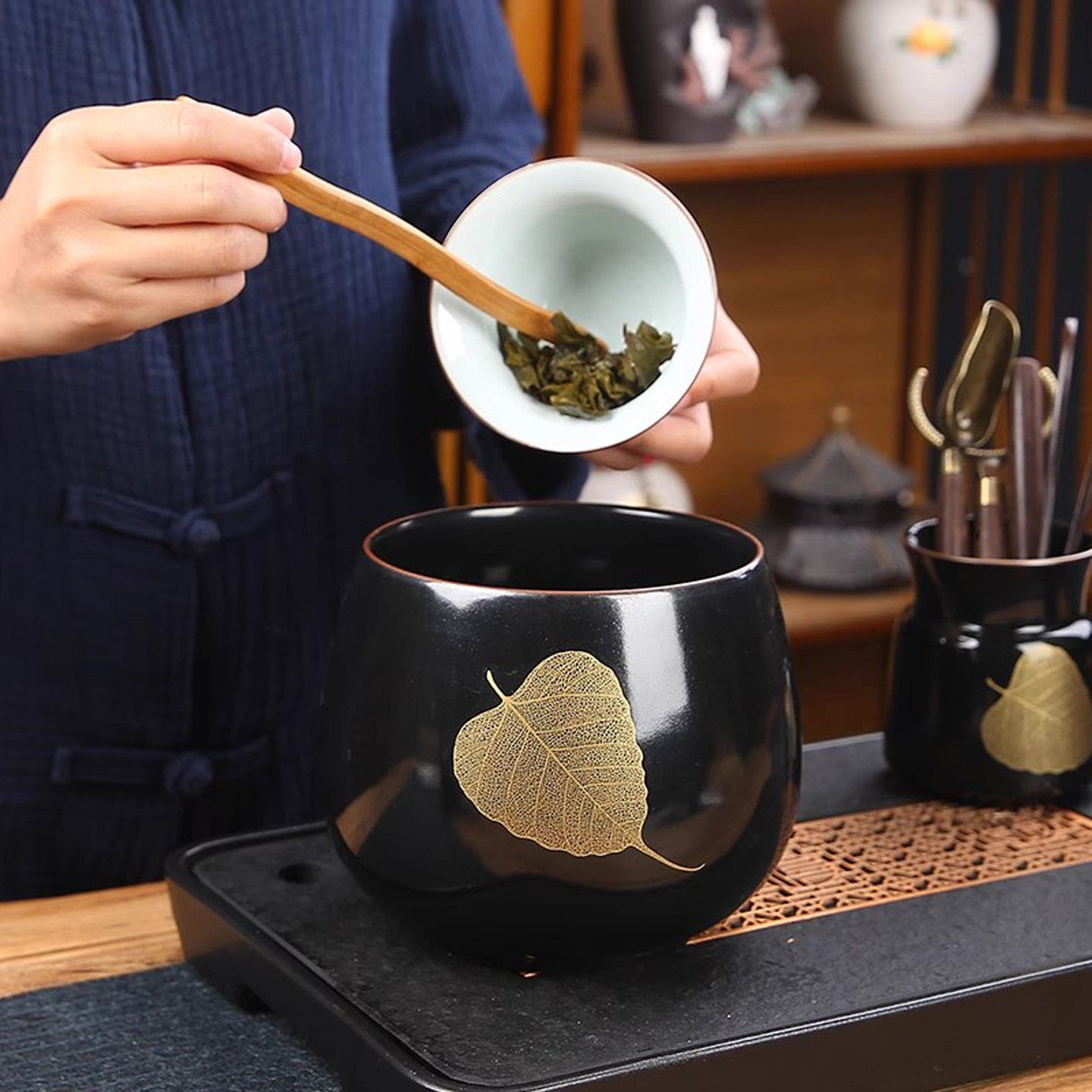 圣立金叶盏茶道茶洗茶渣缸收纳筒
