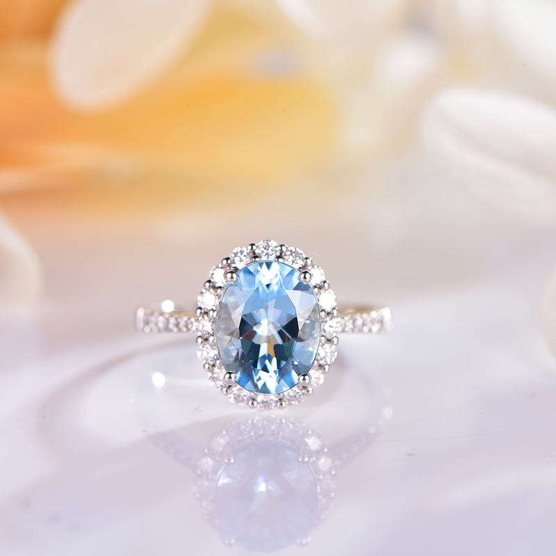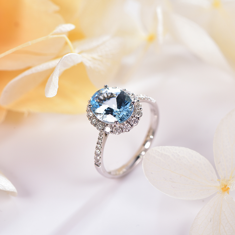 米莱珠宝 4.5克拉3A天然彩宝海蓝宝石戒指18k金镶嵌钻石首饰定制