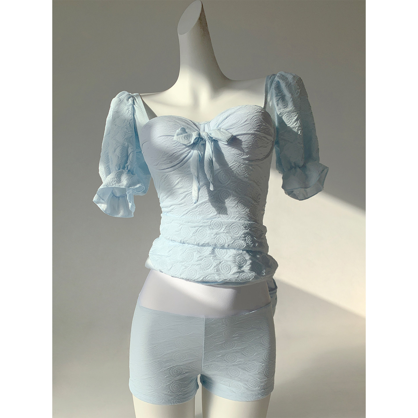 【花影灼灼】浅蓝显白不规则裙式梨形身材遮肉显瘦连体泳衣女新款