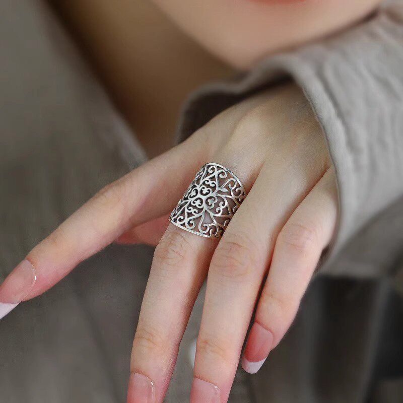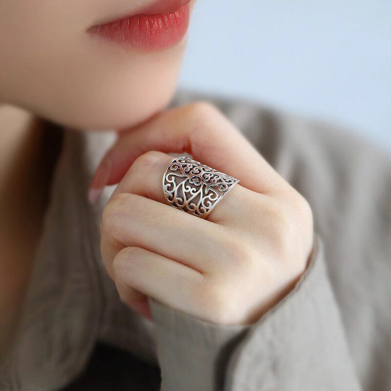 925银复古新中式镂空花纹藤蔓戒指环开口调节女士小众设计高级感