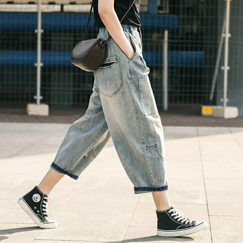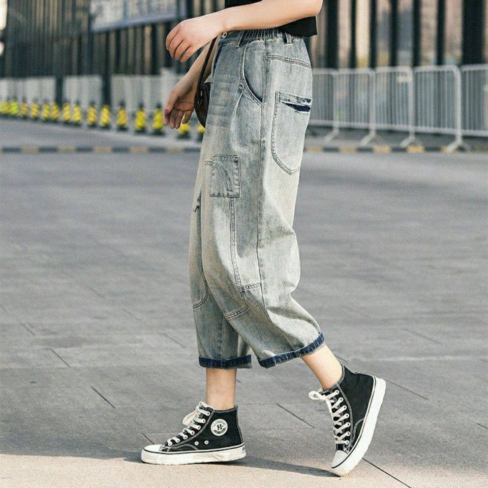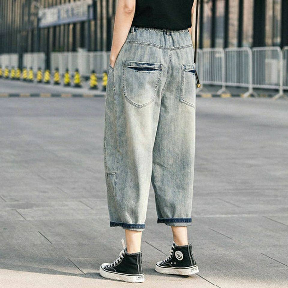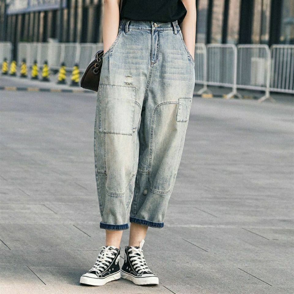 复古文艺浅蓝水洗牛仔裤女小脚裤BF风宽松掉档时尚破洞拼接老爹裤