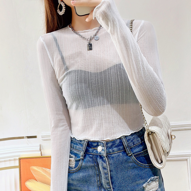 透视白色网纱打底衫女内搭薄款秋季洋气性感亮丝紧身短款蕾丝上衣