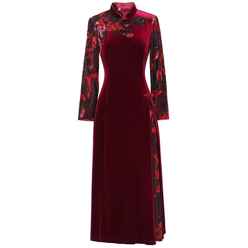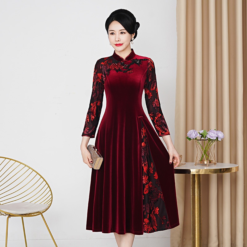 2025新款蕾丝绣花立领改良版连衣裙婚礼婚宴喜婆婆妈妈装修身