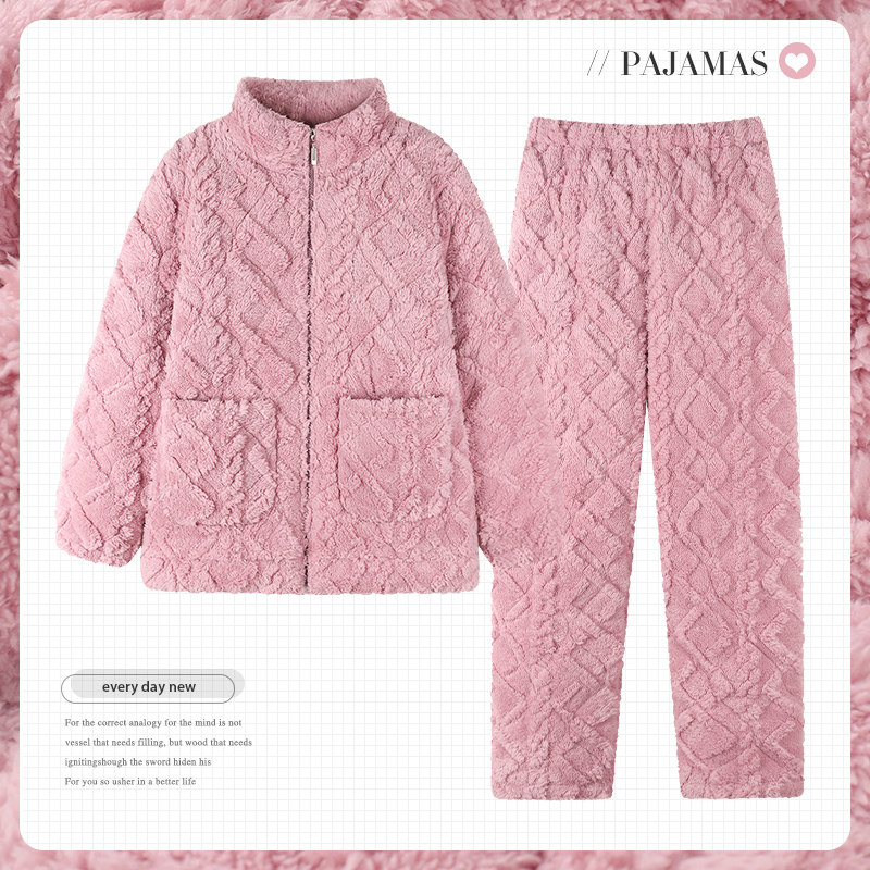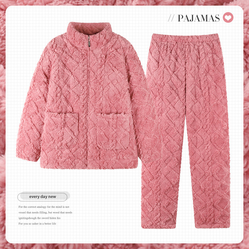 冬天女士三层珊瑚绒夹棉棉袄睡衣女冬季保暖妈妈拉链款家居服套装