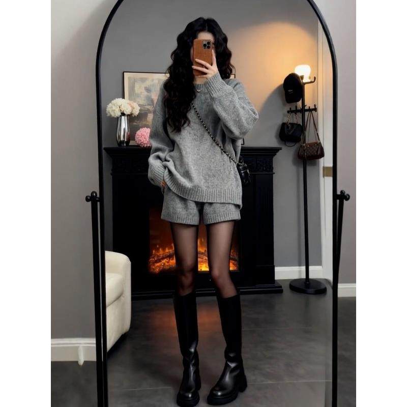 一整套搭配秋装女韩系慵懒风灰色长袖套头毛衣高腰短裤子两件套装