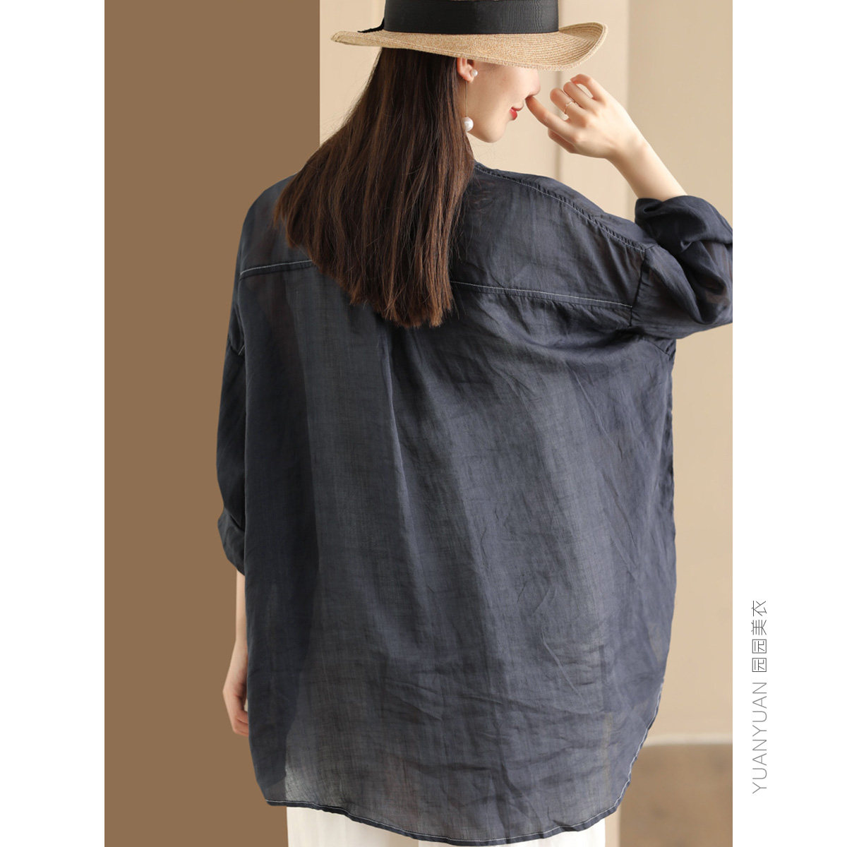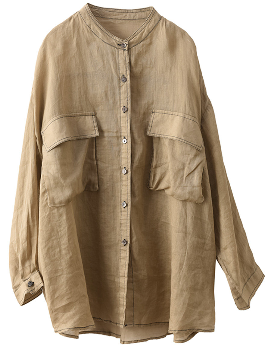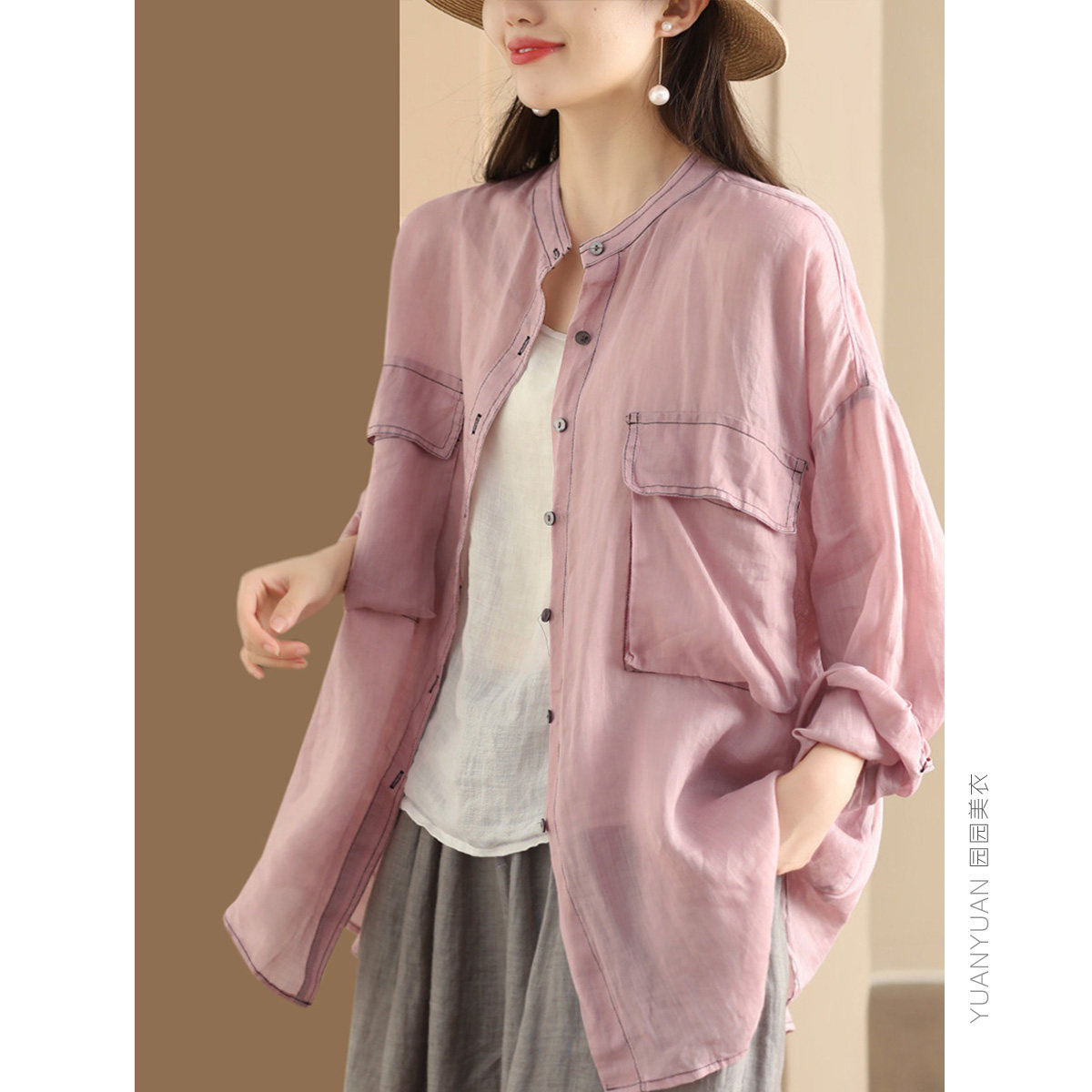 复古双支苎麻衬衣女外套明线大口袋中长款衬衫气质开衫外搭上衣夏