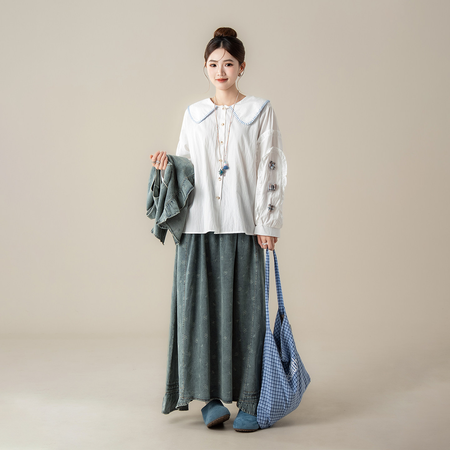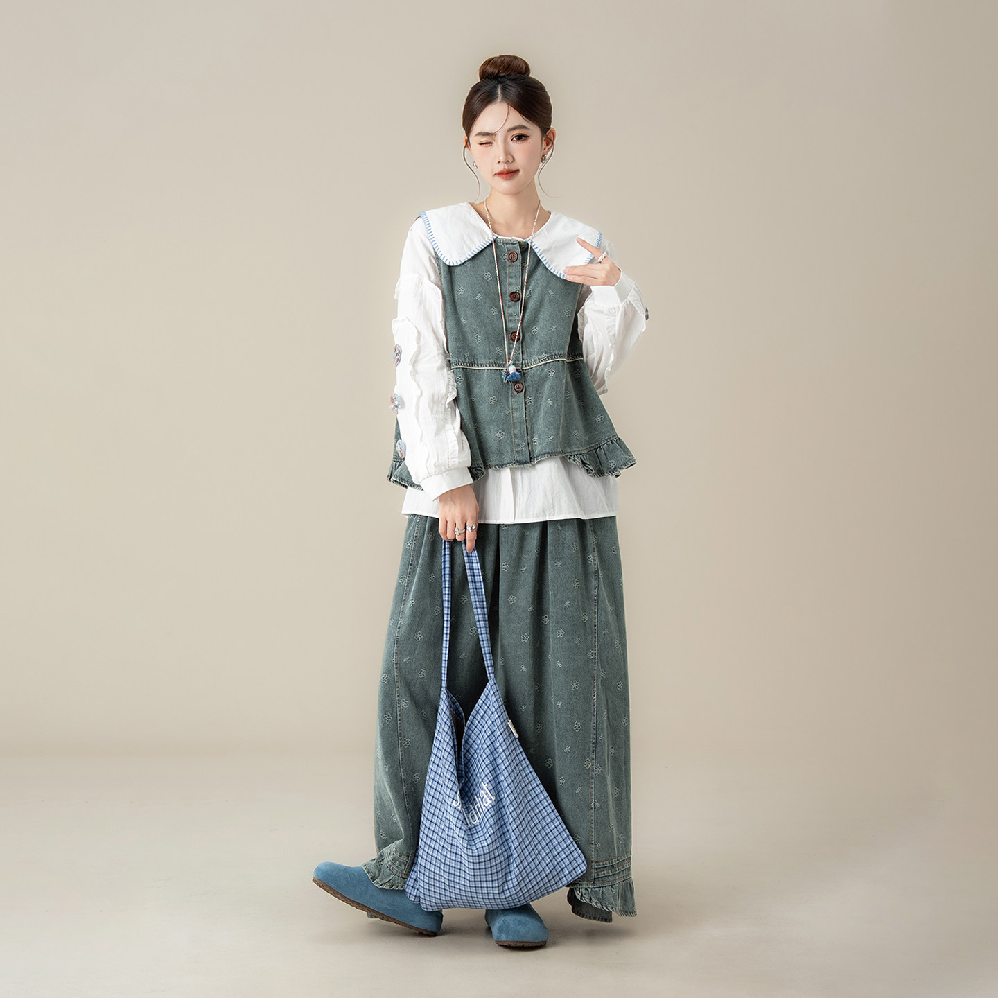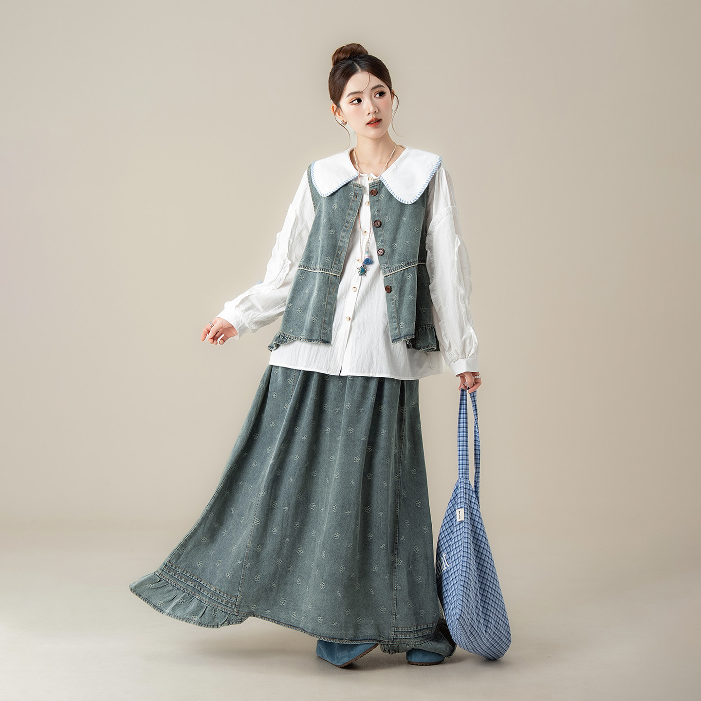白色娃娃领花边长袖衬衫女春季新款叠穿水洗牛仔马甲半身长裙套装