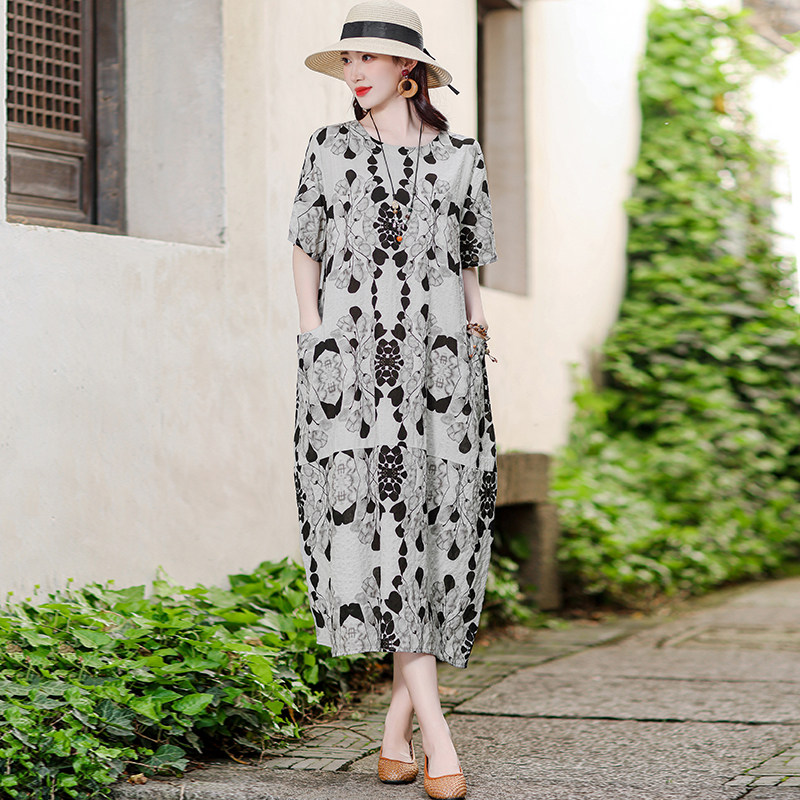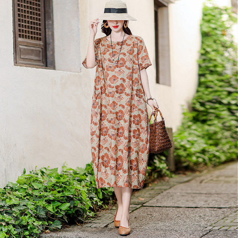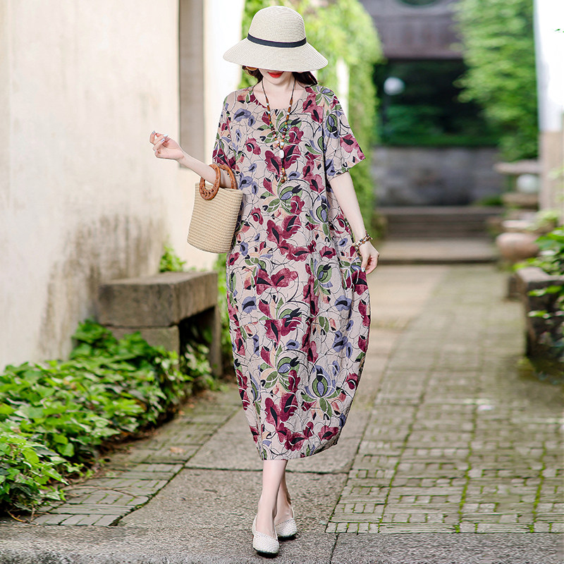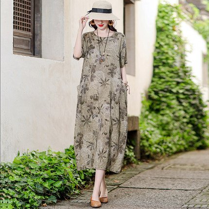 中老年棉麻连衣裙夏新款洋气妈妈装有口袋大码宽松过膝棉绸长裙子
