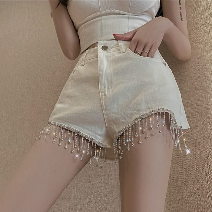 高腰牛仔短裤女2025夏装新款百搭大码胖妹妹显瘦阔腿流苏钉钻热裤