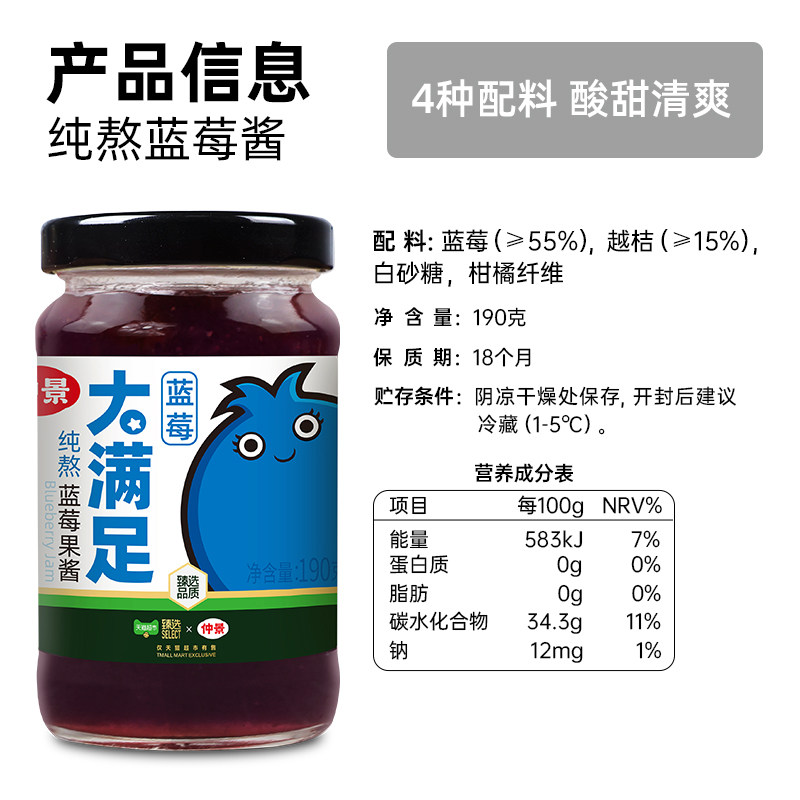 臻选仲景纯熬蓝莓果酱190g大果粒儿童早餐吐司面包轻食健身