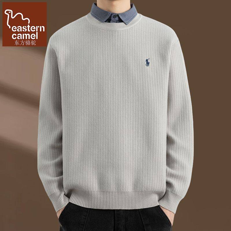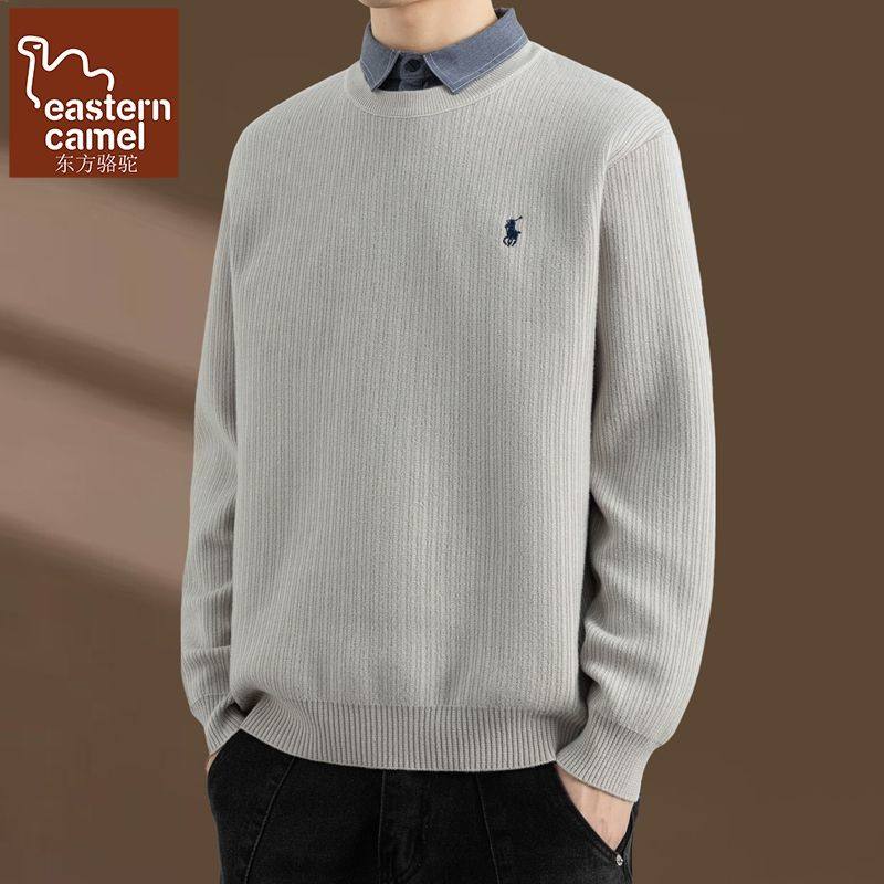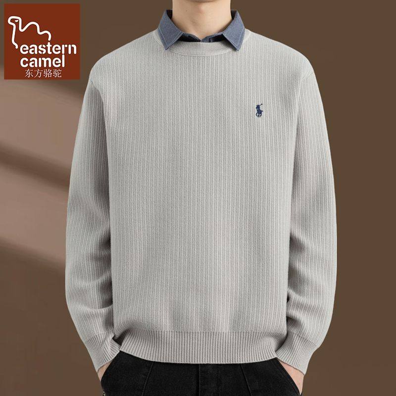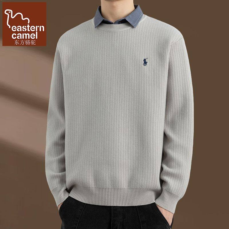 东方骆驼冬季衬衫领假两件毛衣男士帅气加厚保暖内搭针织打底衫男