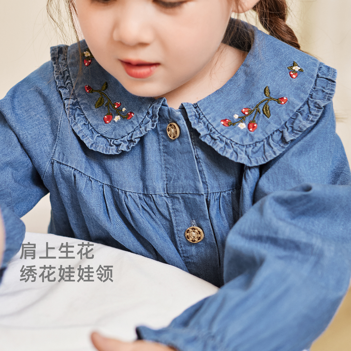 [纯棉抗菌]女童衬衫宝宝秋季软牛仔女小童娃娃领秋装儿童长袖衬衣