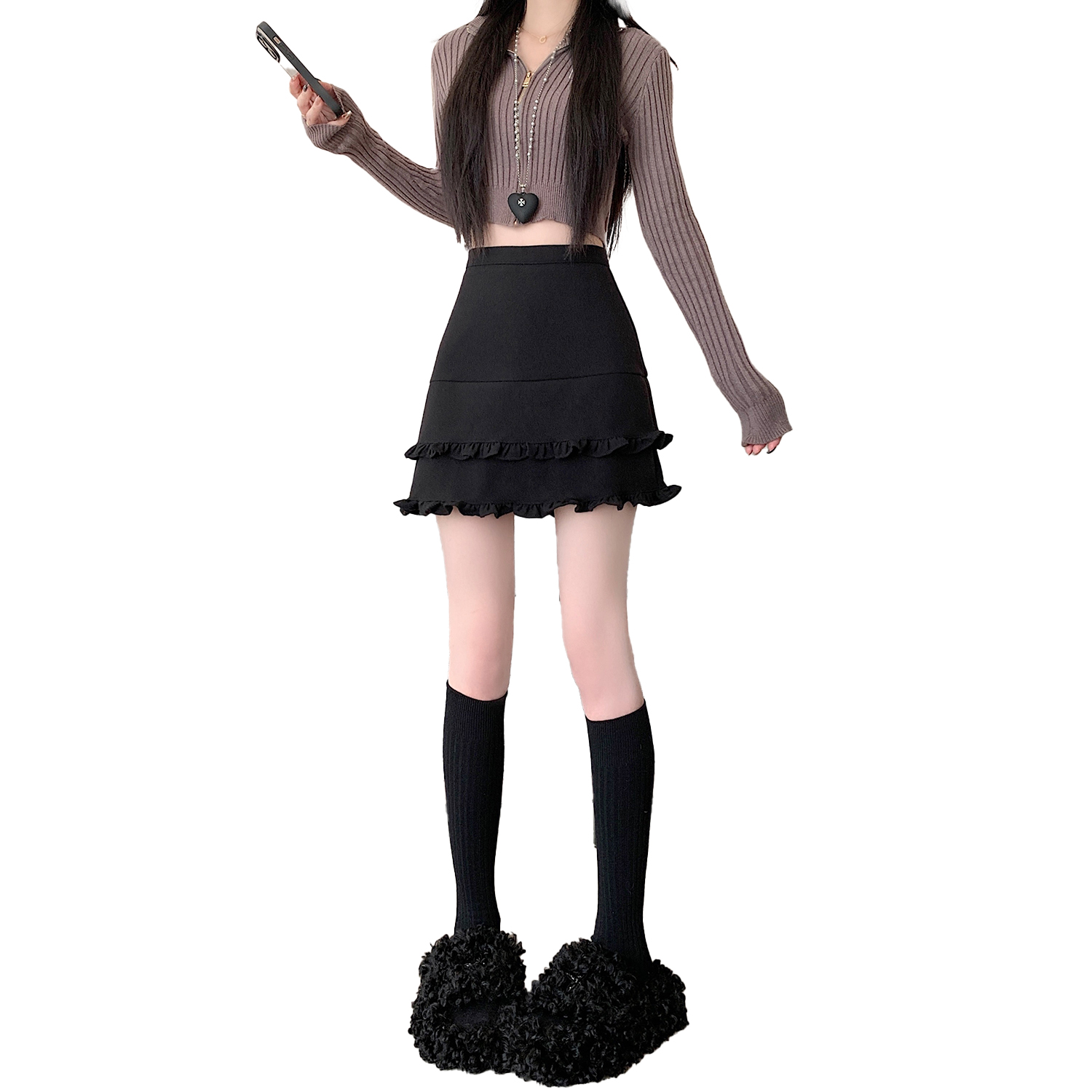 拉夏贝尔法式木耳边A字半身裙女秋季新款高腰显瘦气质防走光短裙M