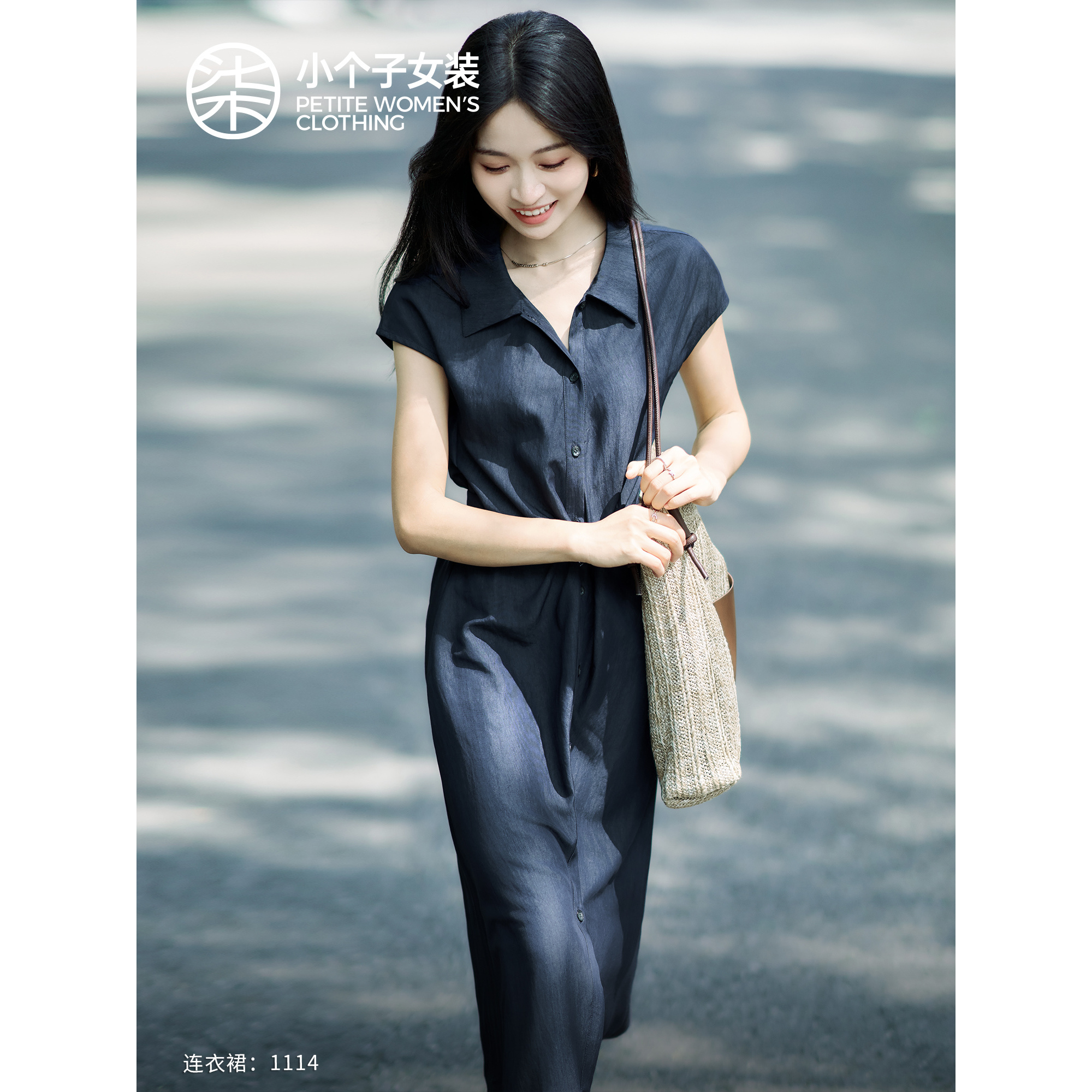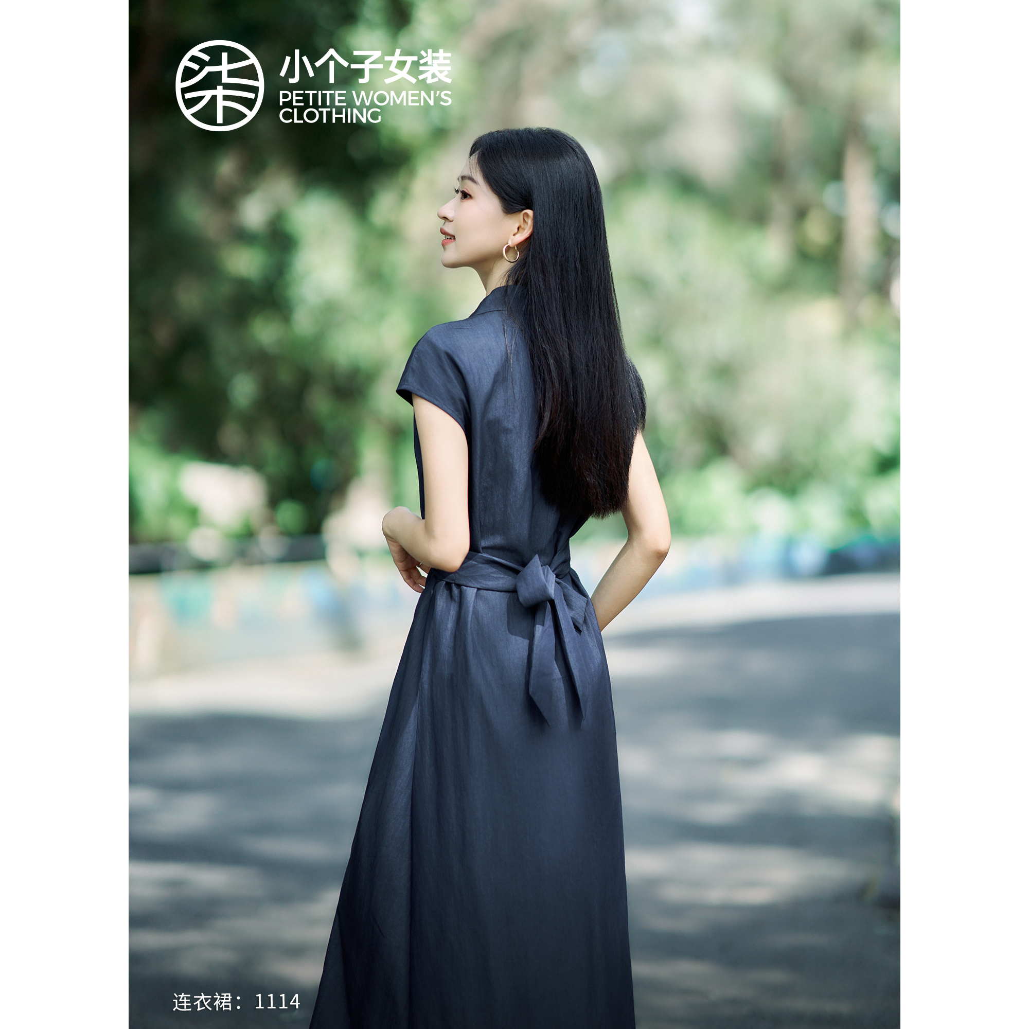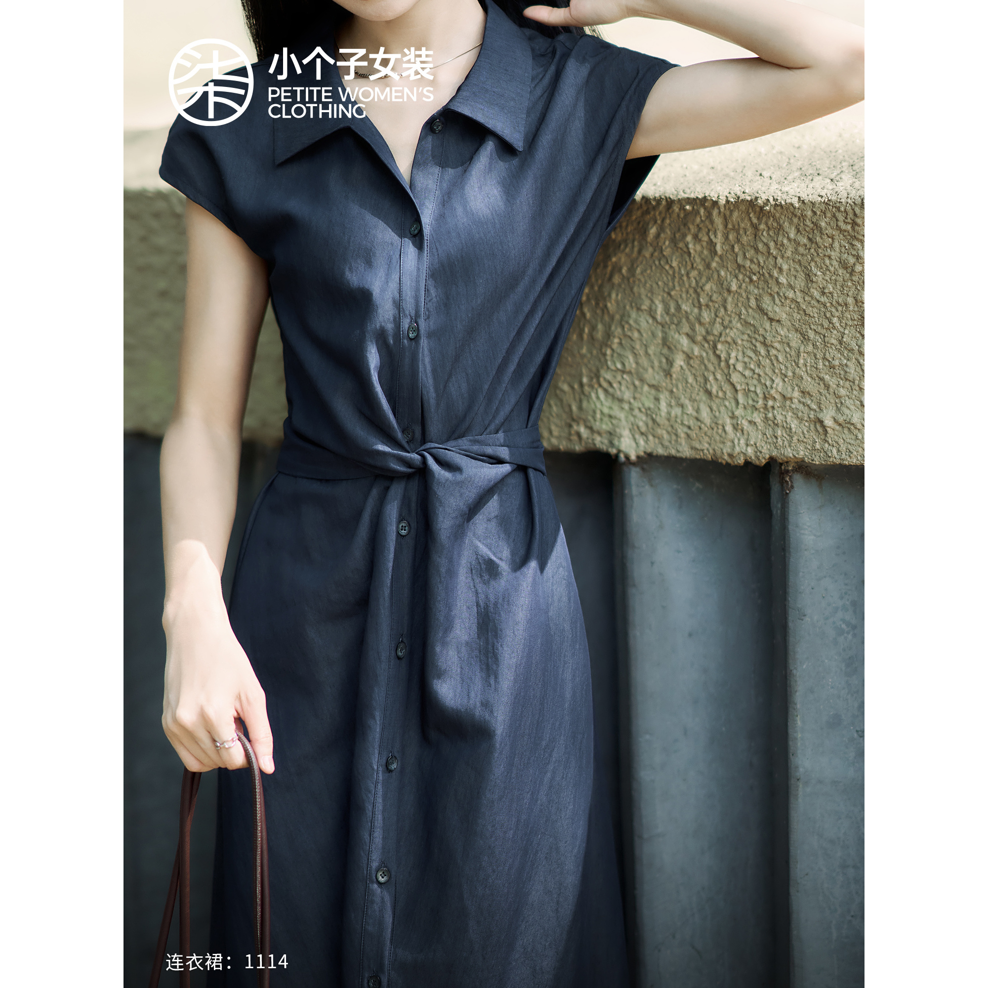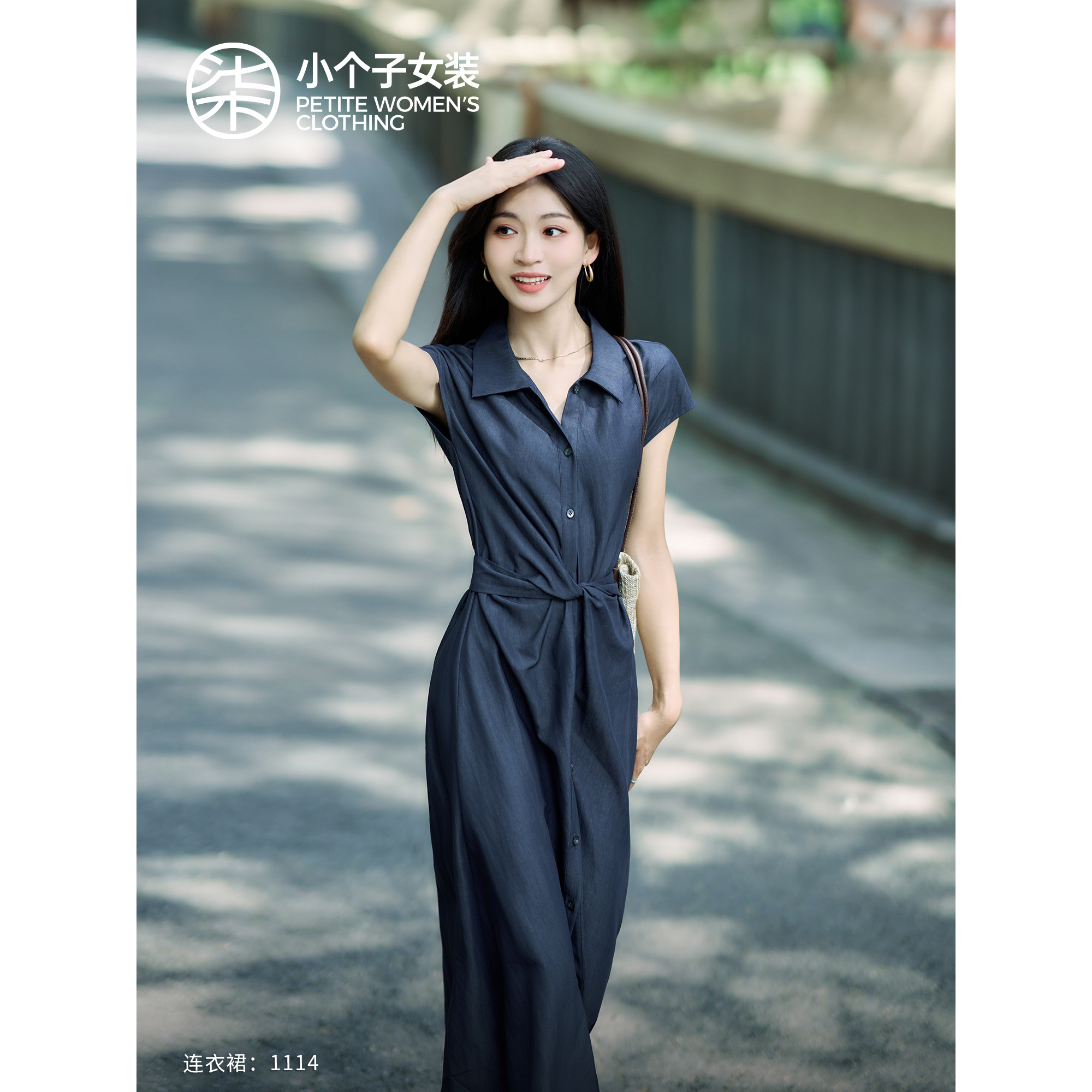 柒量一裁小个子深蓝衬衫式连衣裙腰间系带时尚高腰显瘦夏长裙1114