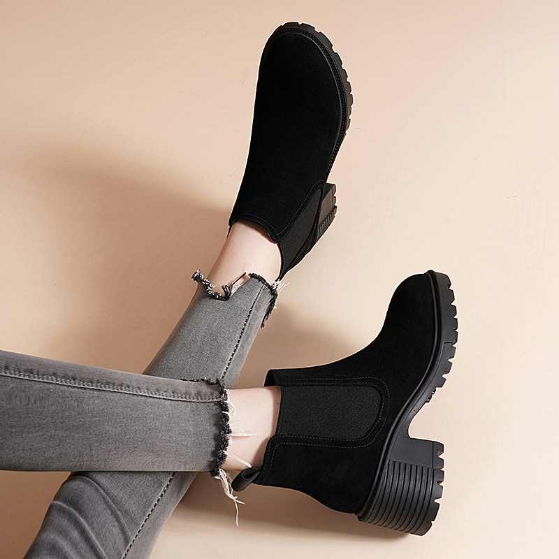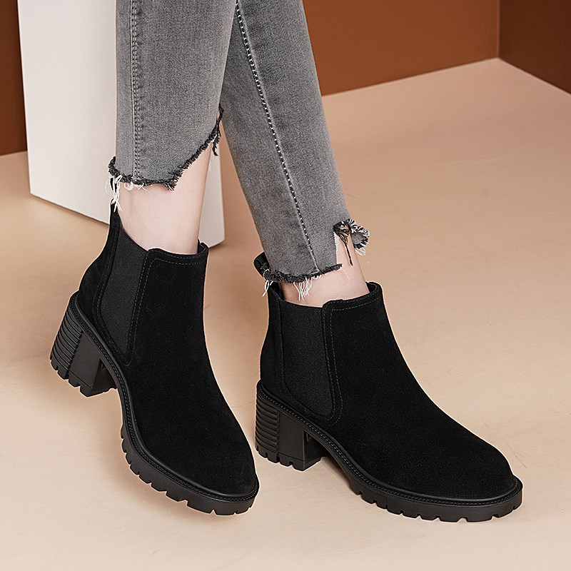 2025秋季新款真皮短靴女磨砂皮高跟粗跟切尔西靴短筒裸靴单靴女鞋