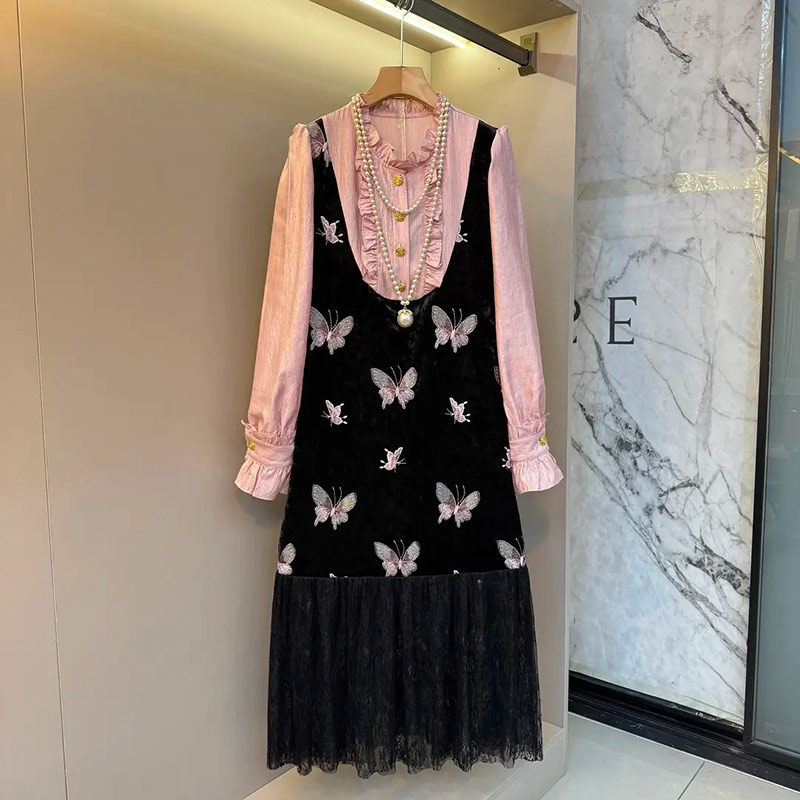 大码女装拼色长袖蝴蝶结假两件连衣裙胖MM秋季款设计感长款淑女裙