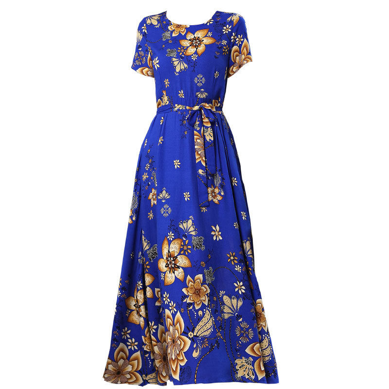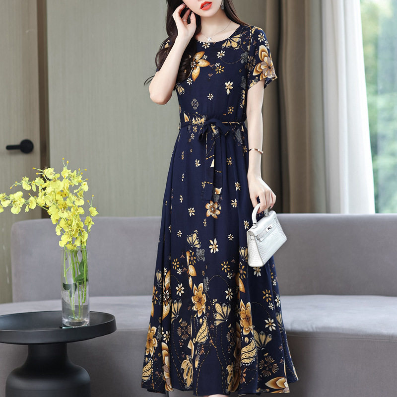 妈妈装夏装棉绸连衣裙大码显瘦中老年女装中长款碎花过膝绵绸长裙
