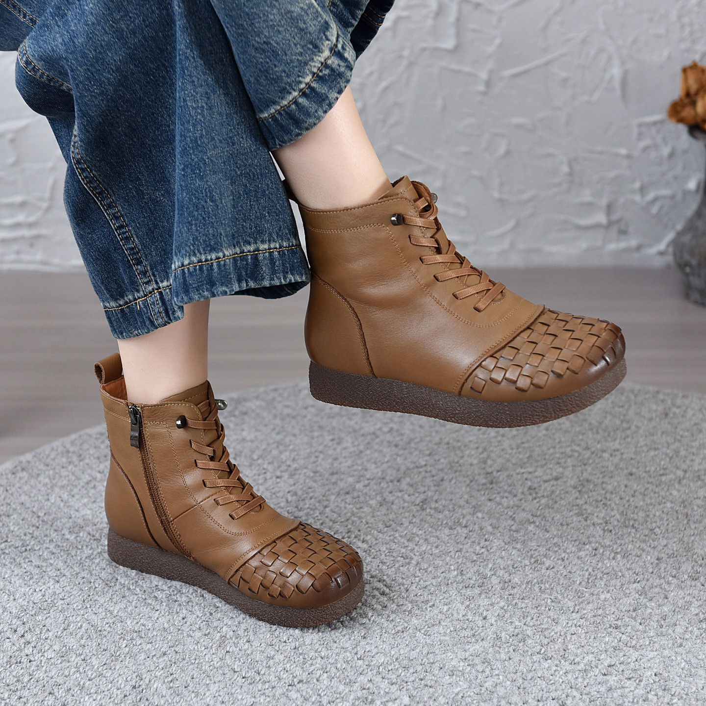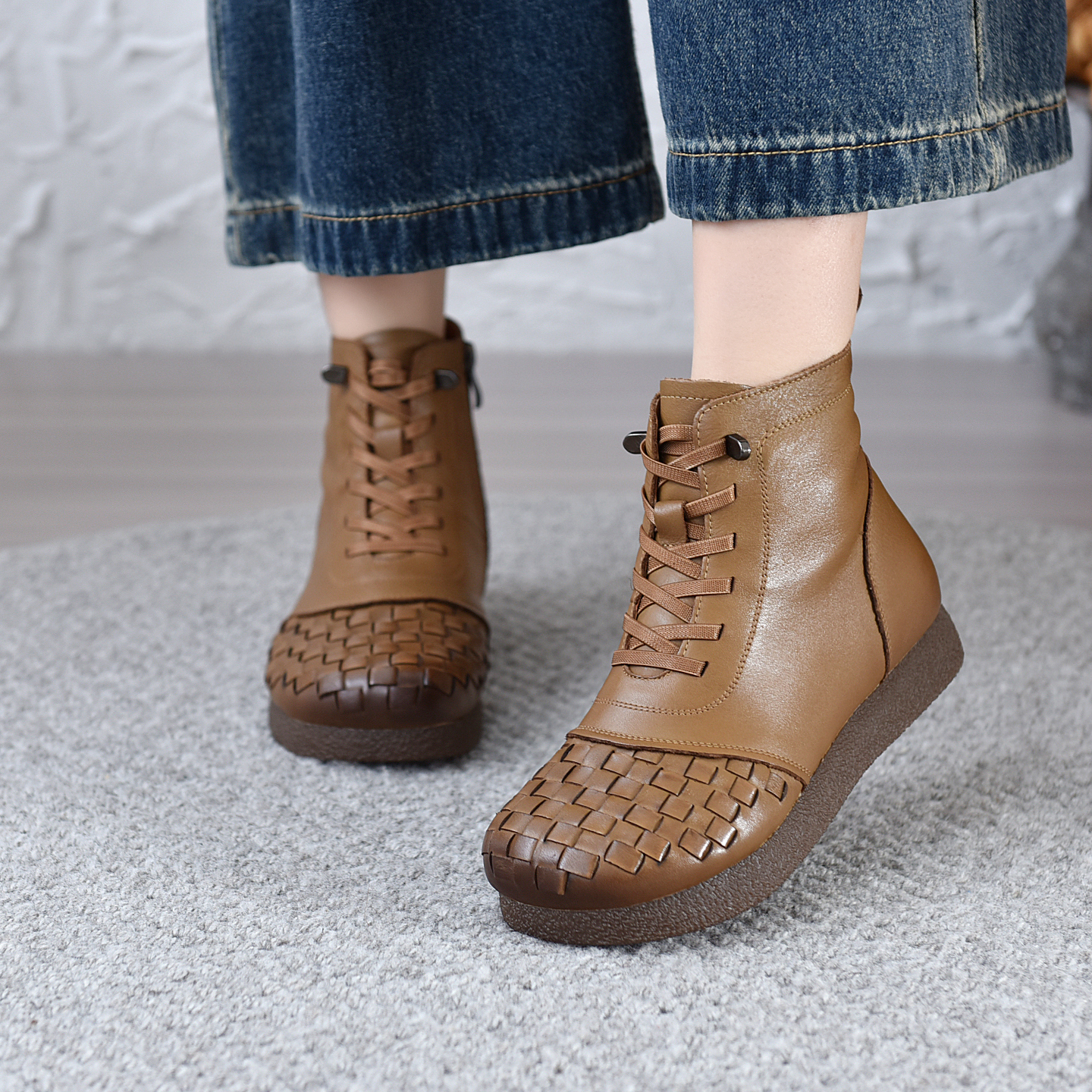 80293头层牛皮平跟编织短靴民族风手工秋冬牛皮靴牛筋底软底女靴
