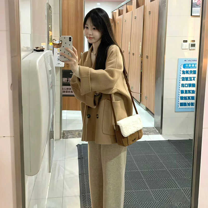 小个子女秋冬新款毛呢外套短款韩版宽松呢子大衣卡其色廓形加厚