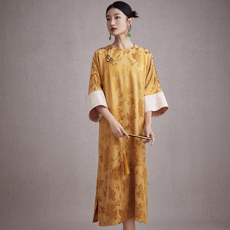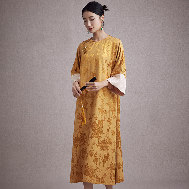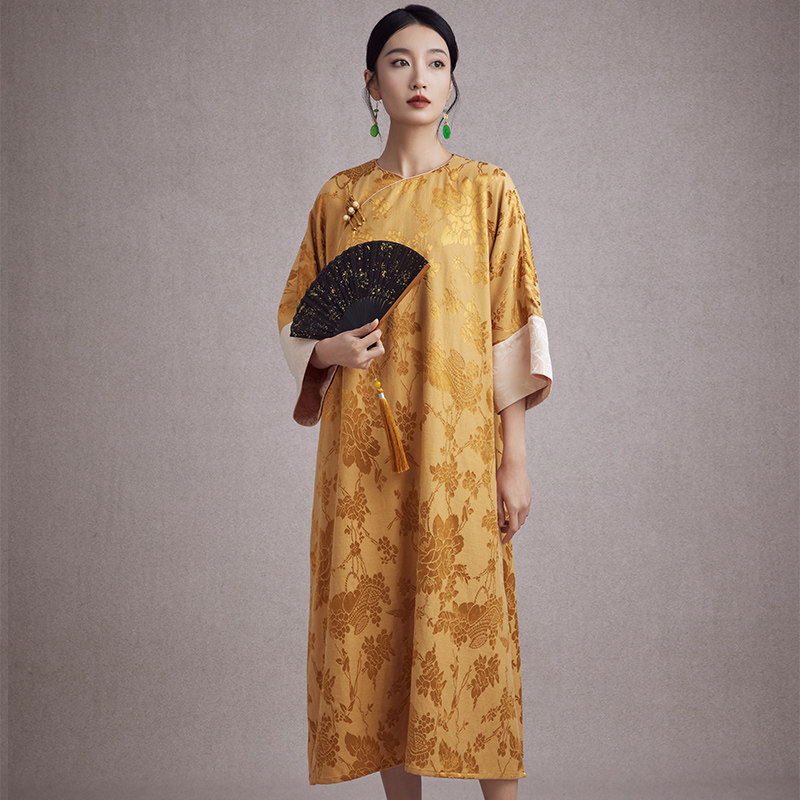 陌遇2025年秋季新款中国风复古女装圆领提花连肩袖宽松旗袍连衣裙
