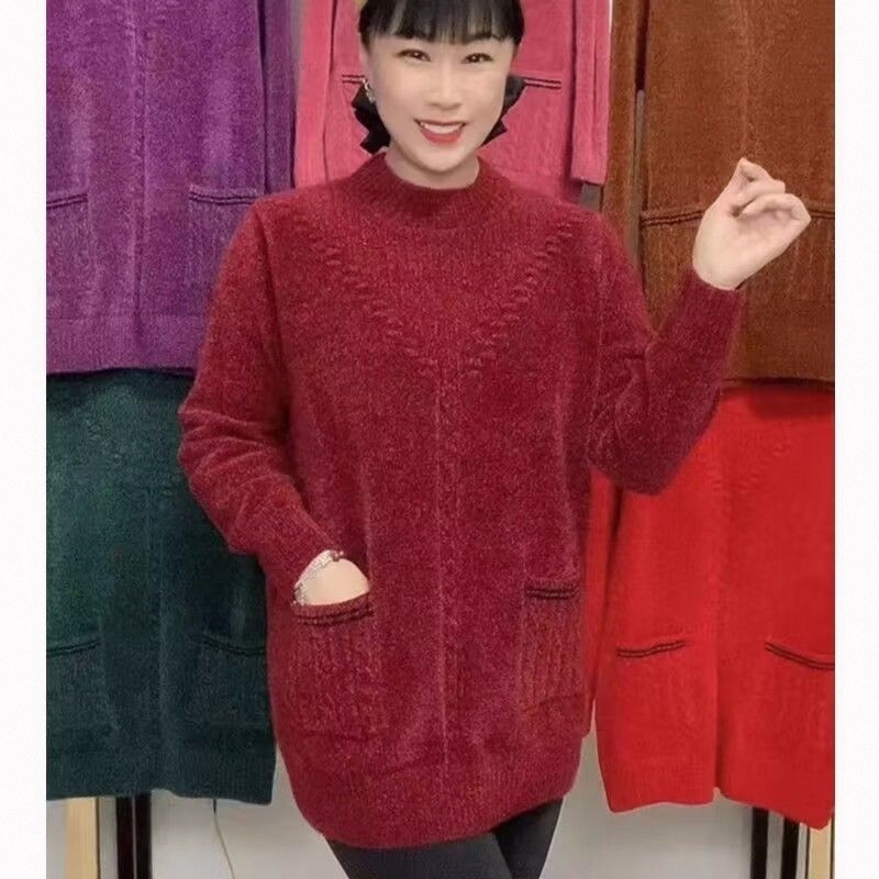 妈妈装秋冬季雪尼尔加厚中长款宽松大码针织打底衫中年女保暖毛衣