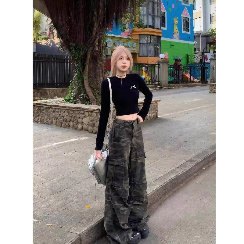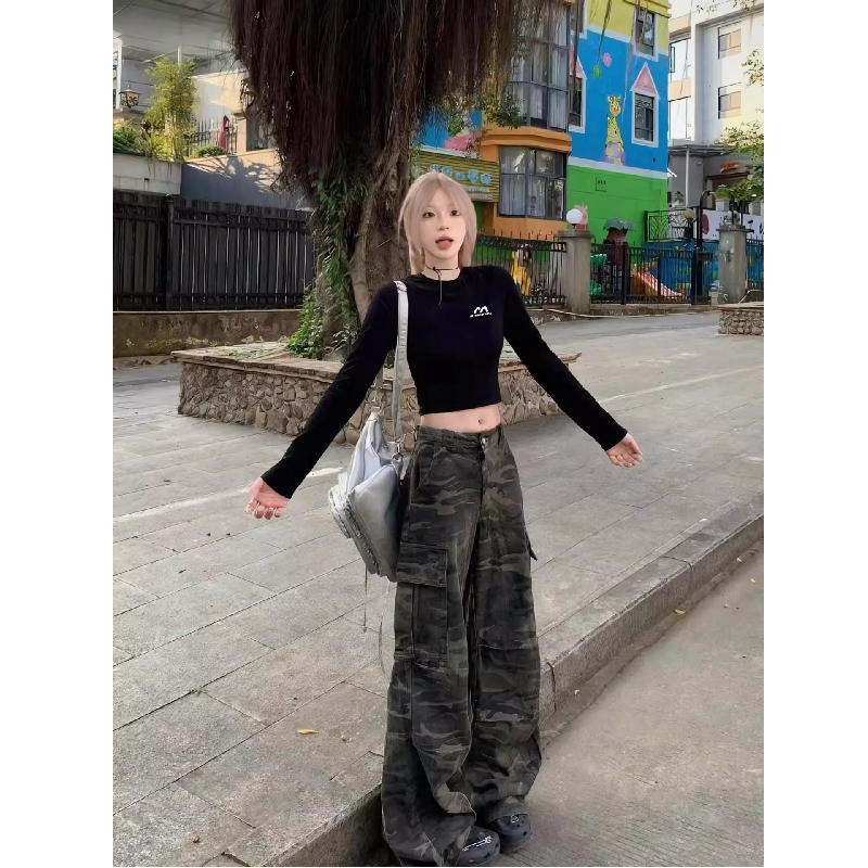 美式复古黑色正肩长袖T恤女秋季辣妹短款内搭打底衫修身露脐上衣