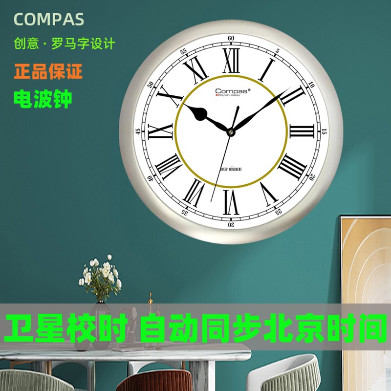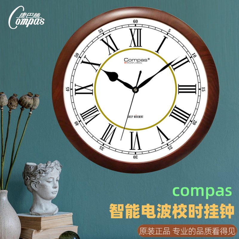 康巴丝时尚时钟15寸客厅大气电波石英钟罗马刻度木纹静音圆形挂钟