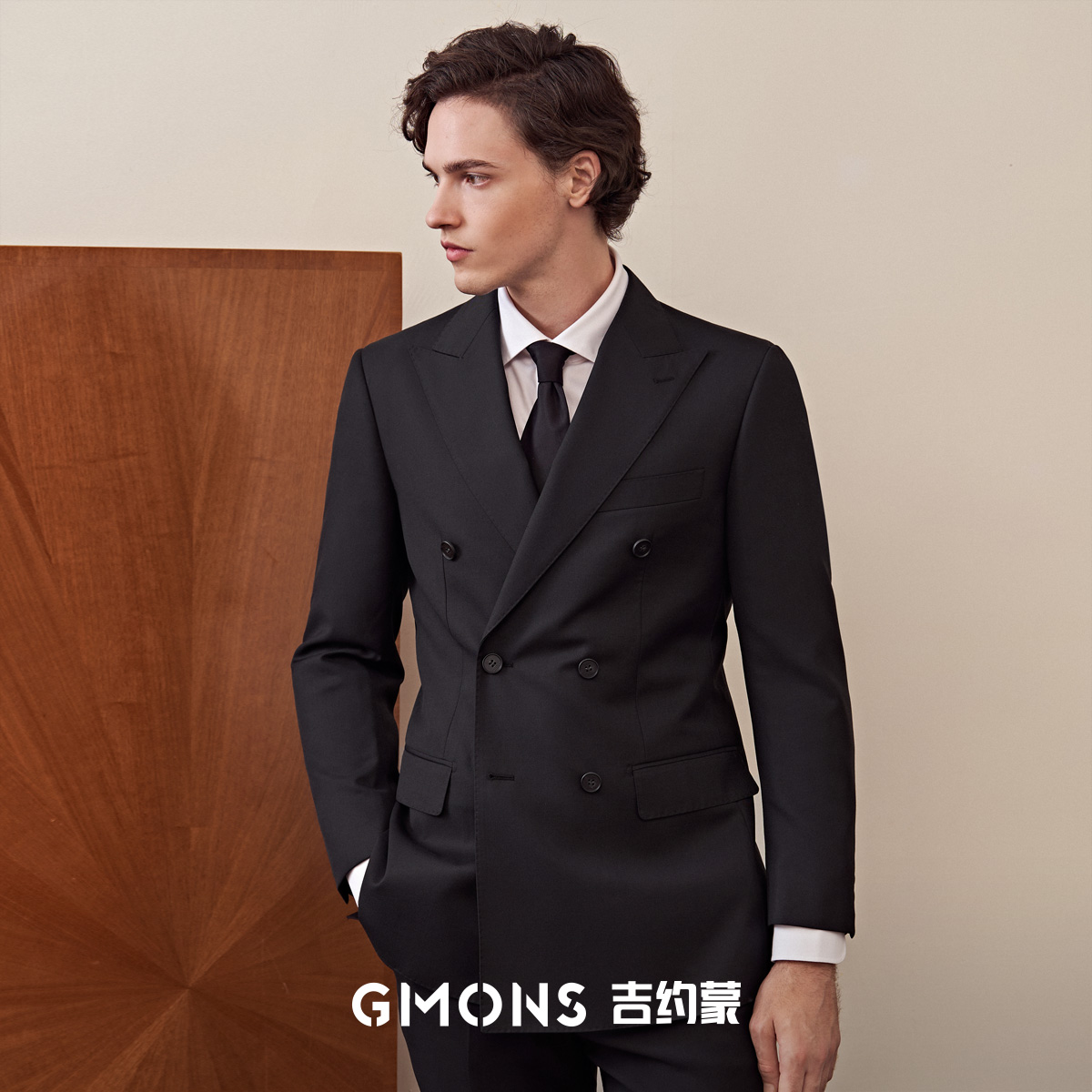 吉约蒙双排扣羊毛西服套装男黑色商务正装西装高级感新郎结婚礼服