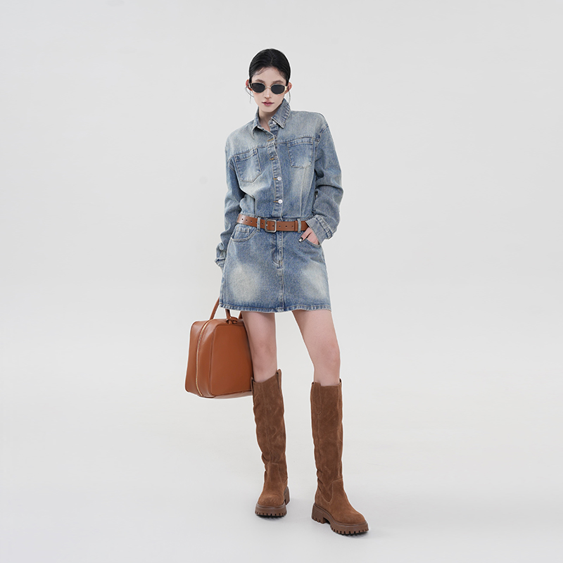吴童童蓝色翻领长袖牛仔连衣裙女春季新款韩系复古A字短款包臀裙