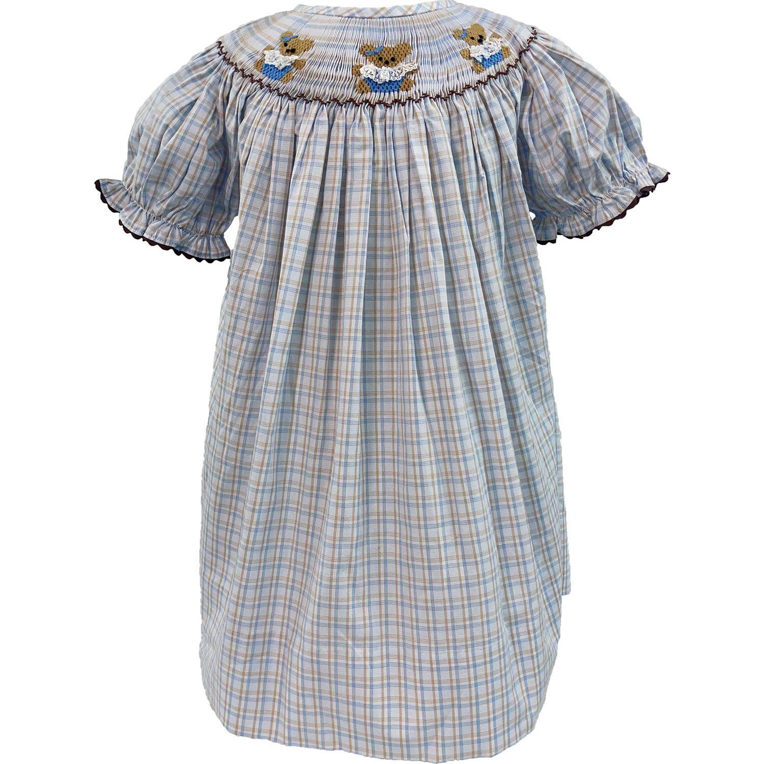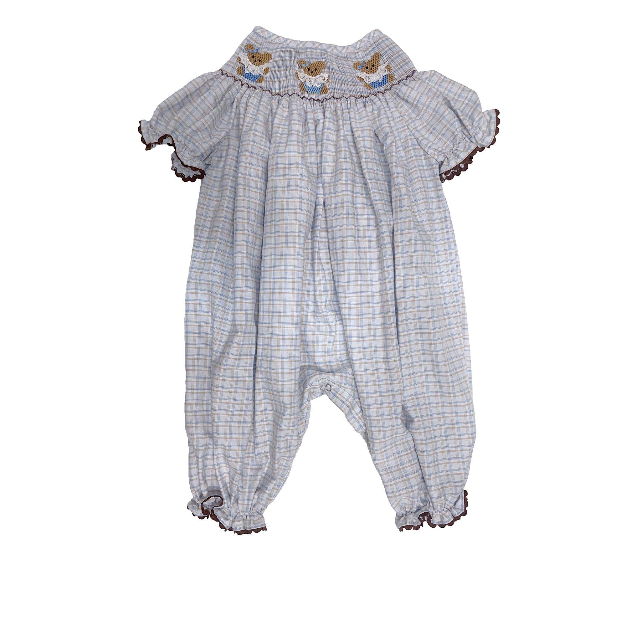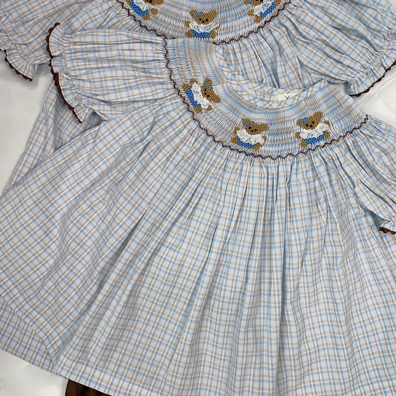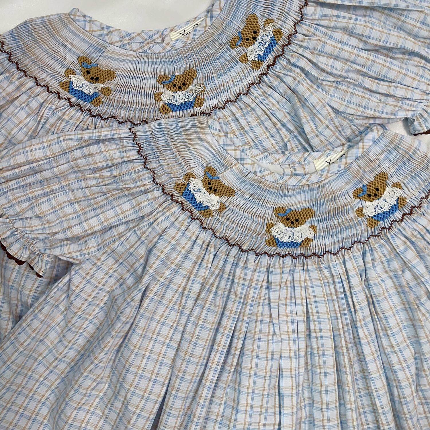 夏季蕾丝小熊手工打揽刺绣连衣裙格纹纯棉分体套装泡泡袖连体爬服