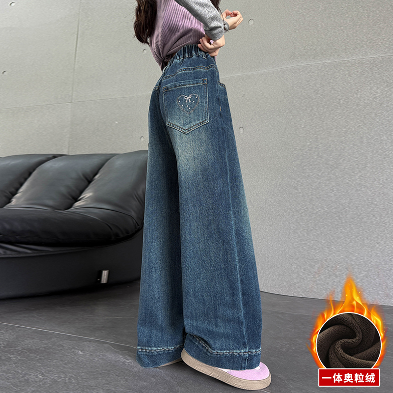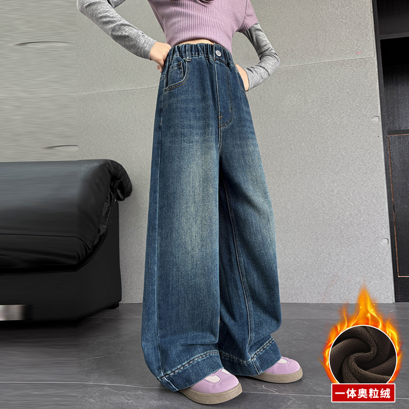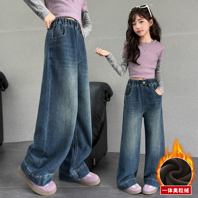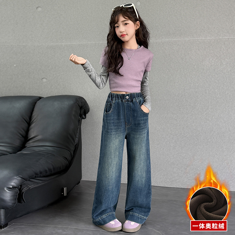女童加绒牛仔裤秋冬款2025新款冬装儿童直筒阔腿裤加厚一体绒裤子