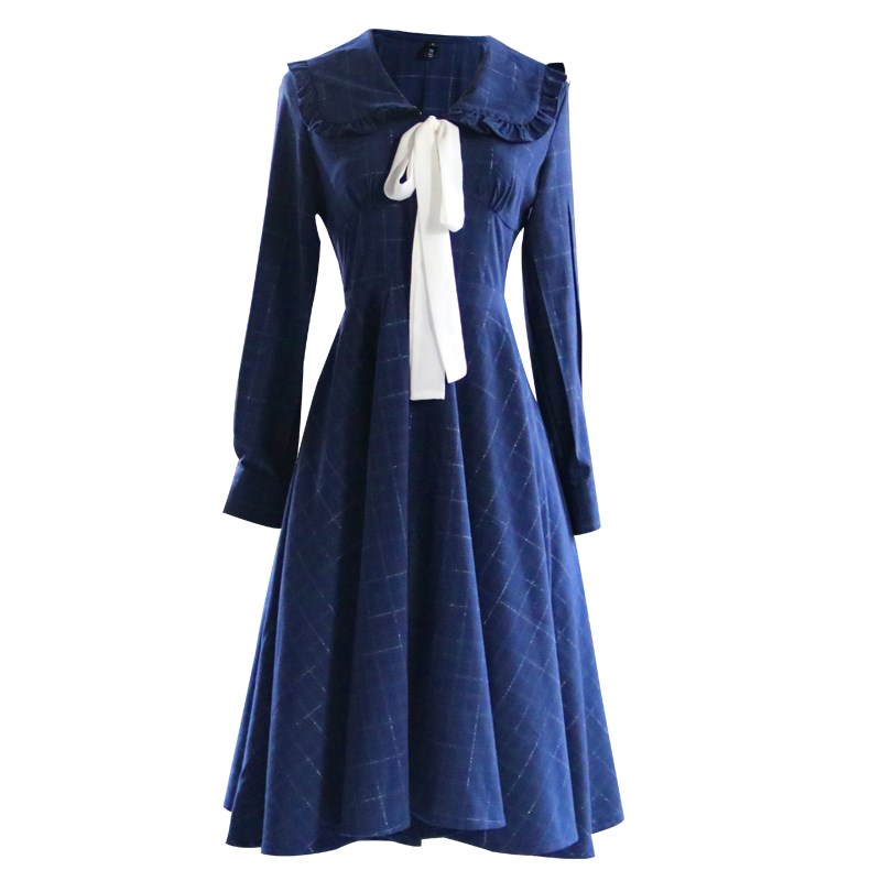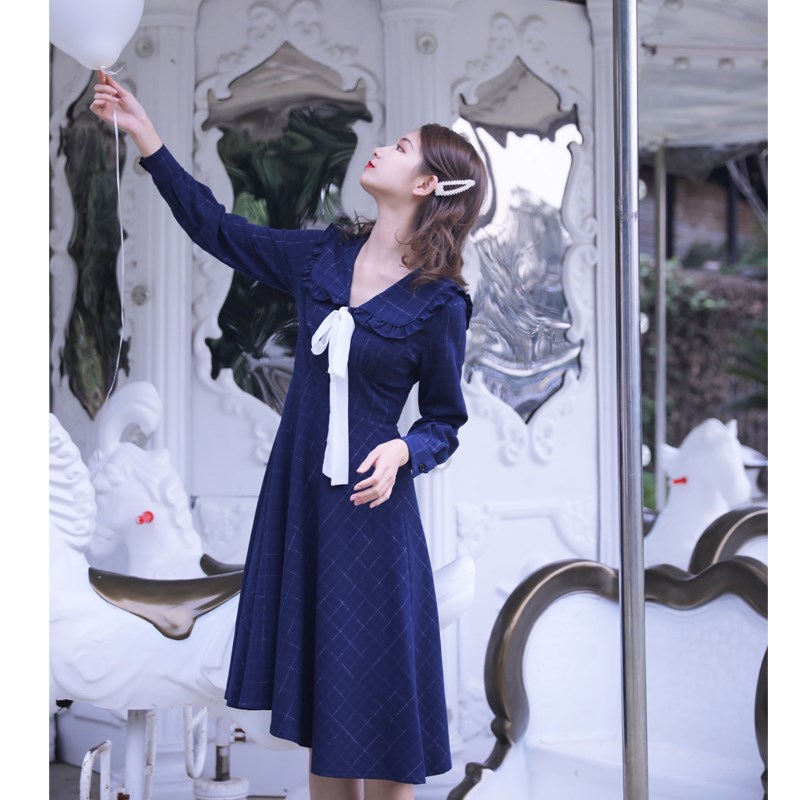 春秋季法式复古娃娃领格子连衣裙学院风长袖裙子蓝色打底裙小众女