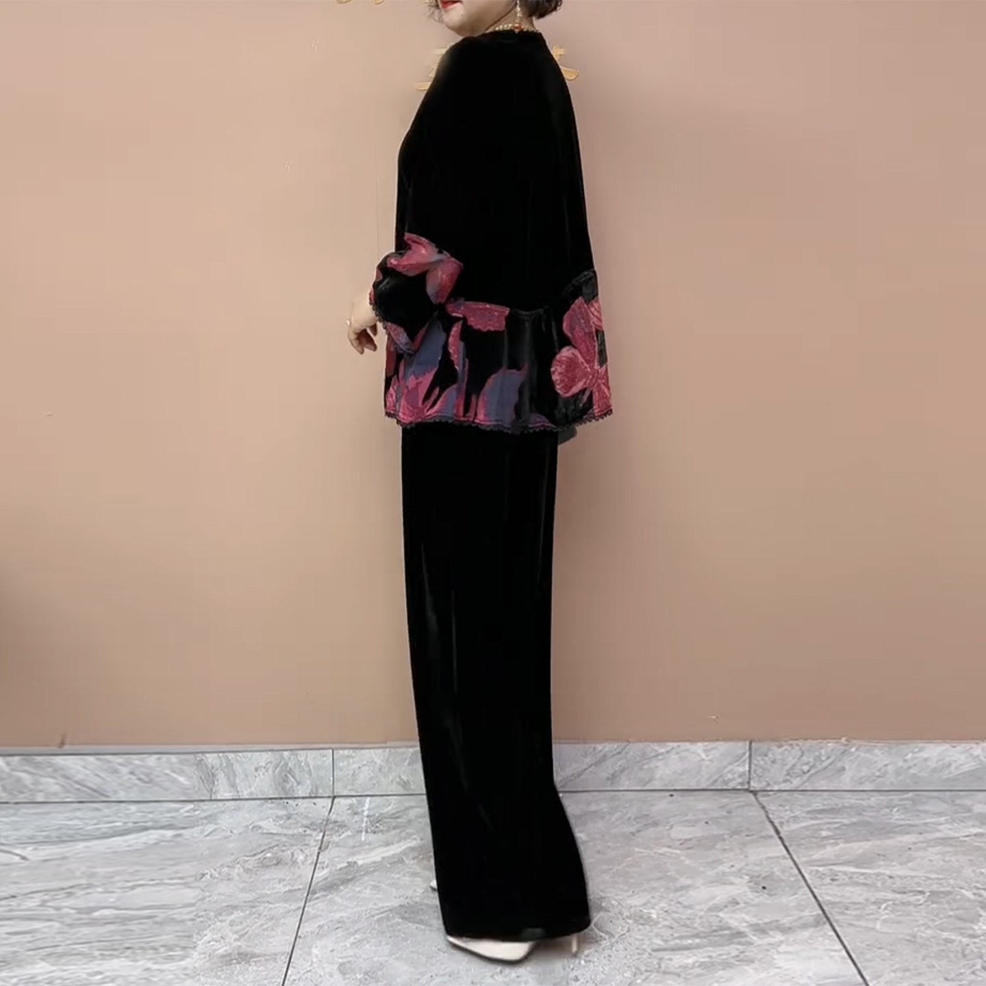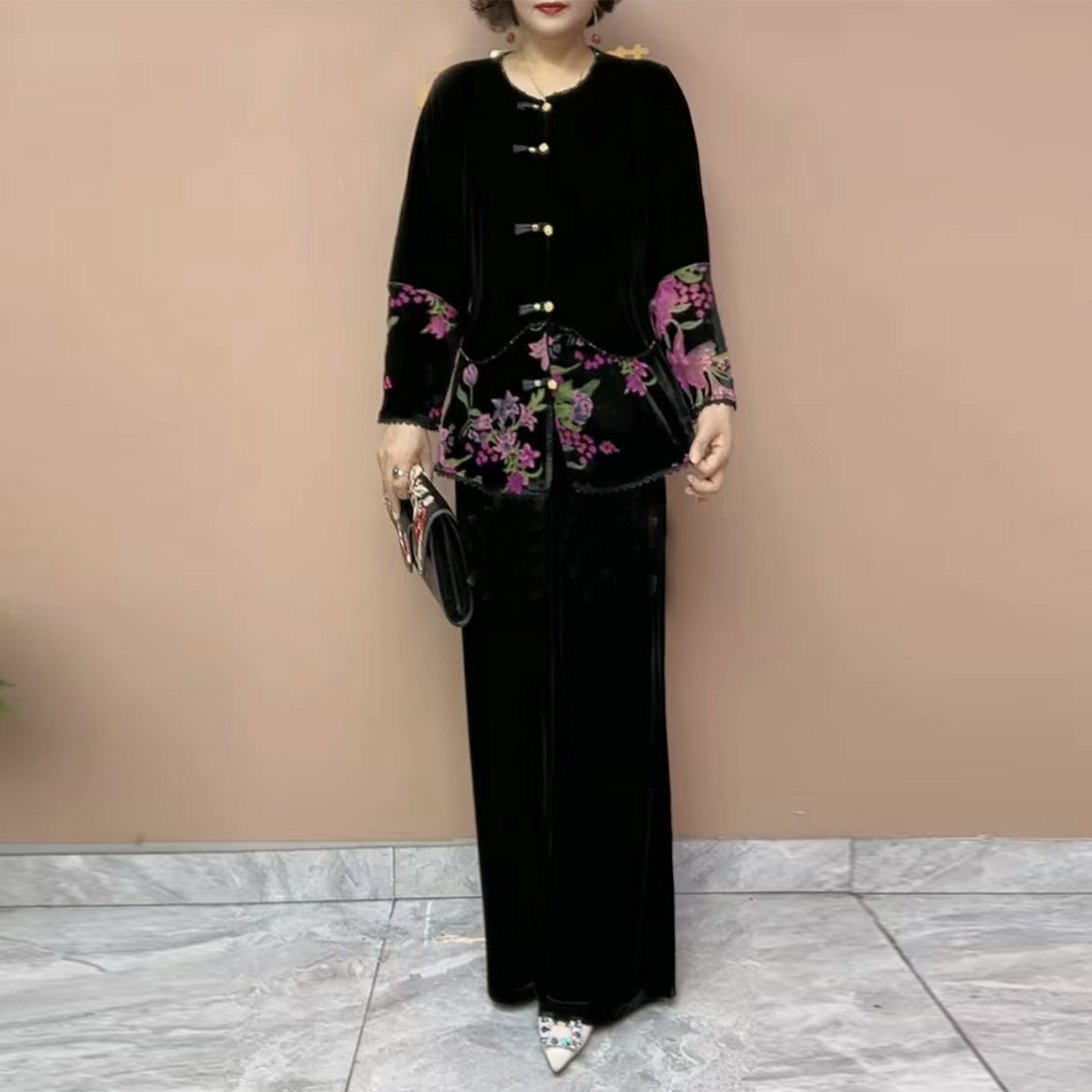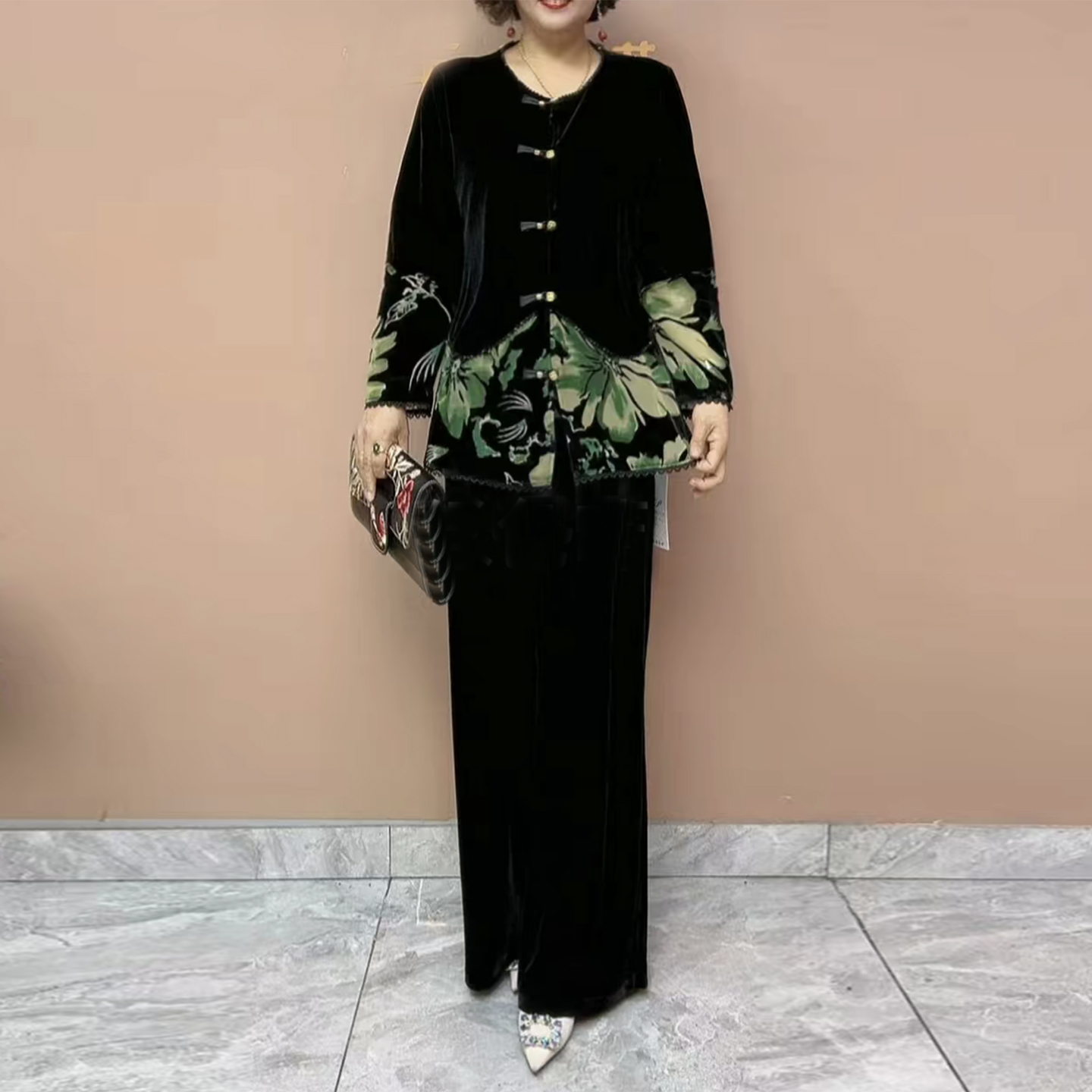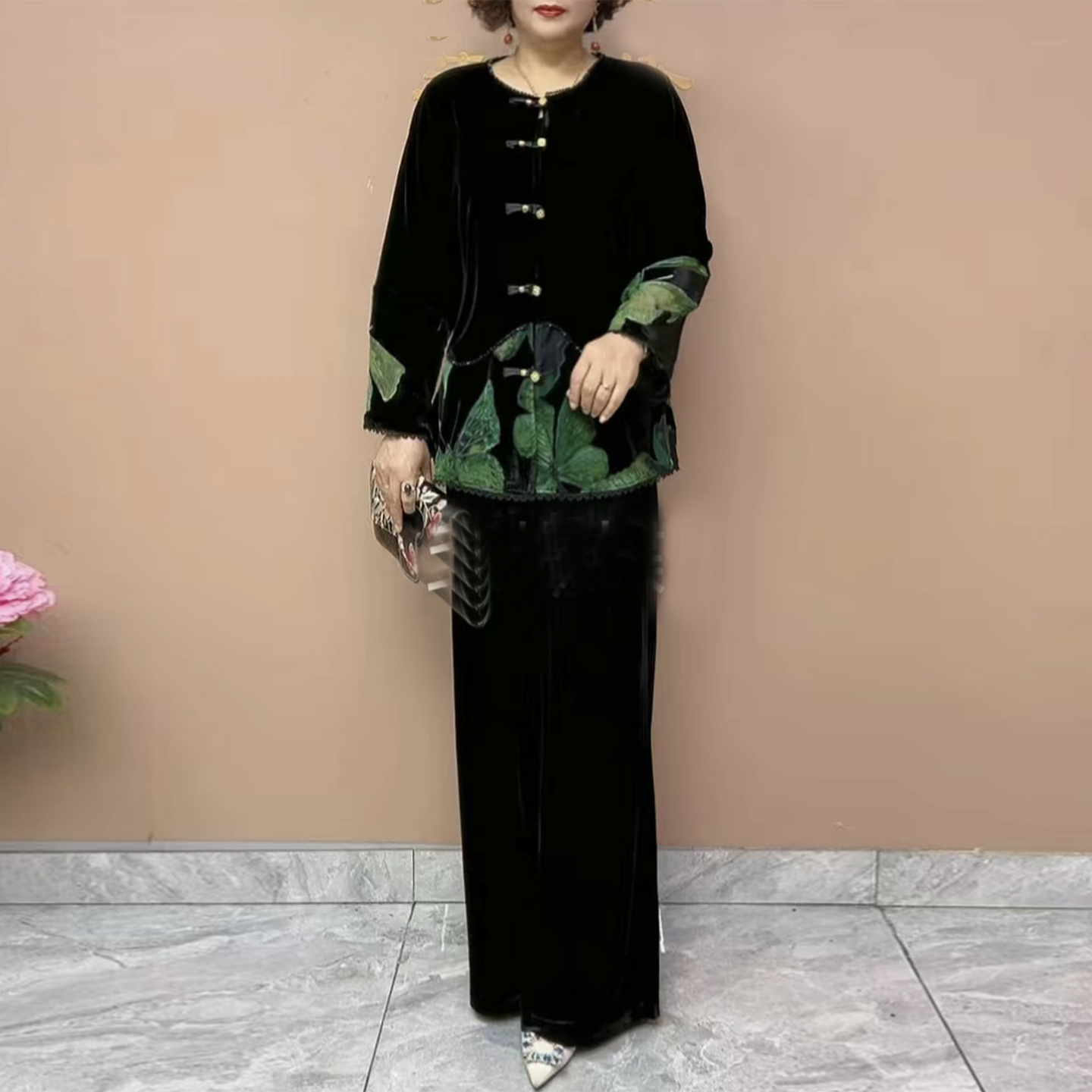 时尚妈妈丝绒烧花外套早秋新款高档撞色设计上衣阔腿裤大码两件套